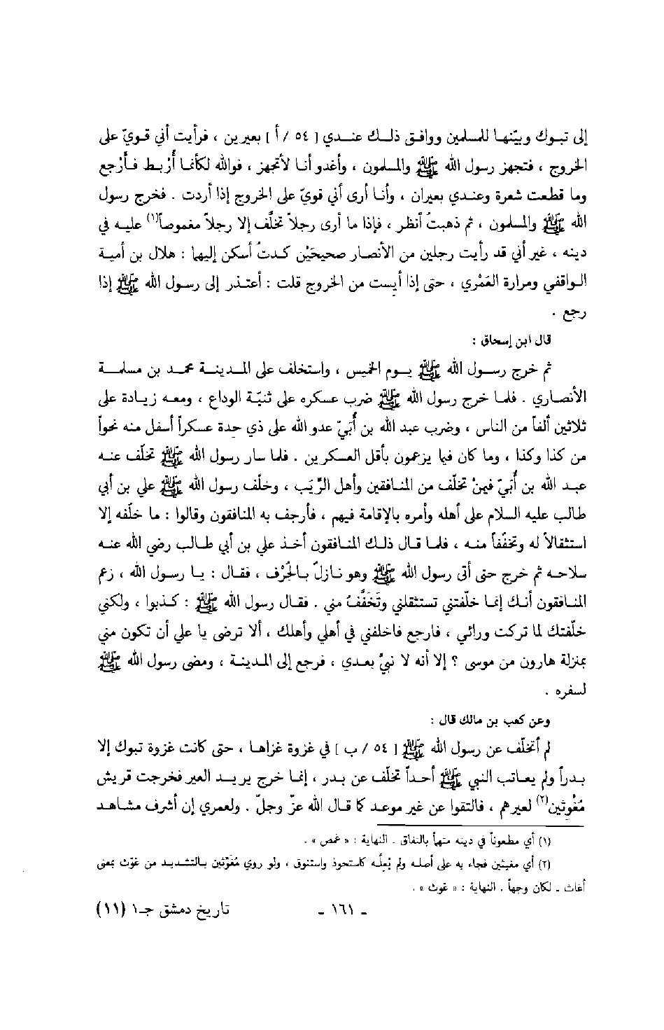 ثم خرج رسول الله صَلَّى اللهُ عَلَيْهِ وَسَلَّمَ يوم الخميس، واستخلف على المدينة محمد بن مسلمة الأنصاري. فلما خرج رسول الله صَلَّى اللهُ عَلَيْهِ وَسَلَّمَ ضرب عسكره على ثنية الوداع، ومعه زيادة على ثلاثين ألفاً من الناس، وضرب عبد الله بن أبي عدو الله على ذي حدة عسكراً أسفل منه نحواً من كذا وكذا، وما كان فيما يزعمون بأقل العسكرين. فلما سار رسول الله صَلَّى اللهُ عَلَيْهِ وَسَلَّمَ تخلف عنه عبد الله بن أبي فيمن تخلف من المنافقين وأهل الريب، وخلف رسول الله صَلَّى اللهُ عَلَيْهِ وَسَلَّمَ علي بن أبي طالب عليه السلام على أهله وأمره بالإقامة فيهم، فأرجف به المنافقون وقالوا: ما خلفه إلا استثقالاً له وتخففاً منه، فلما قال ذلك المنافقون أخذ علي بن أبي طالب رضي الله عنه سلاحه ثم خرج حتى أتى رسول الله صَلَّى اللهُ عَلَيْهِ وَسَلَّمَ وهو نازل بالجرف، فقال: يا رسول الله، زعم المنافقون أنك إنما خلفتني تستثقلني وتخفف مني. فقال رسول الله صَلَّى اللهُ عَلَيْهِ وَسَلَّمَ: كذبوا، ولكني خلفتك لما تركت ورائي، فارجع فأخلفني في أهلي وأهلك، ألا ترضى يا علي أن تكون مني بمنزلة هارون من موسى؟ إلا أنه لا نبي بعدي، فرجع إلى المدينة، ومضى رسول الله صَلَّى اللهُ عَلَيْهِ وَسَلَّمَ لسفره.
