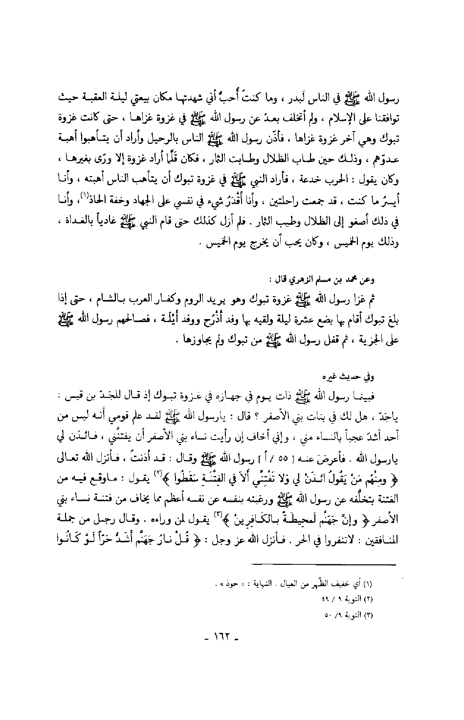 رسول الله صَلَّى اللهُ عَلَيْهِ وَسَلَّمَ في الناس لبدر، وما كنت أحب أني شهدتها مكان بيعتي ليلة العقبة حيث توافقنا على الإسلام، ولم أتخلف بعد عن رسول الله صَلَّى اللهُ عَلَيْهِ وَسَلَّمَ في غزوة غزاها، حتى كانت غزوة تبوك وهي آخر غزوة غزاها، فأذن رسول الله صَلَّى اللهُ عَلَيْهِ وَسَلَّمَ الناس بالرحيل وأراد أن يتأهبوا أهبة عدوهم، وذلك حين طاب الظلال وظابت الثمار، فكان قلما أراد غزوة إلا ورى بغيرها، وكان يقول: الحرب خدعة، فأراد النبي صَلَّى اللهُ عَلَيْهِ وَسَلَّمَ في غزوة تبوك أن يتأهب الناس أهبته، وأنا أيسر ما كنت، قد جمعت راحلتين، وأنا أقدر شيء في نفسي على الجهاد وخفة الحاذ، وأنا في ذلك أصغوا إلى الظلال وطيب الثمار. فلم أزل كذلك حتى قام النبي صَلَّى اللهُ عَلَيْهِ وَسَلَّمَ غادياً بالغداة، وذلك يوم الخميس، وكان يحب أن يخرج يوم الخميس.