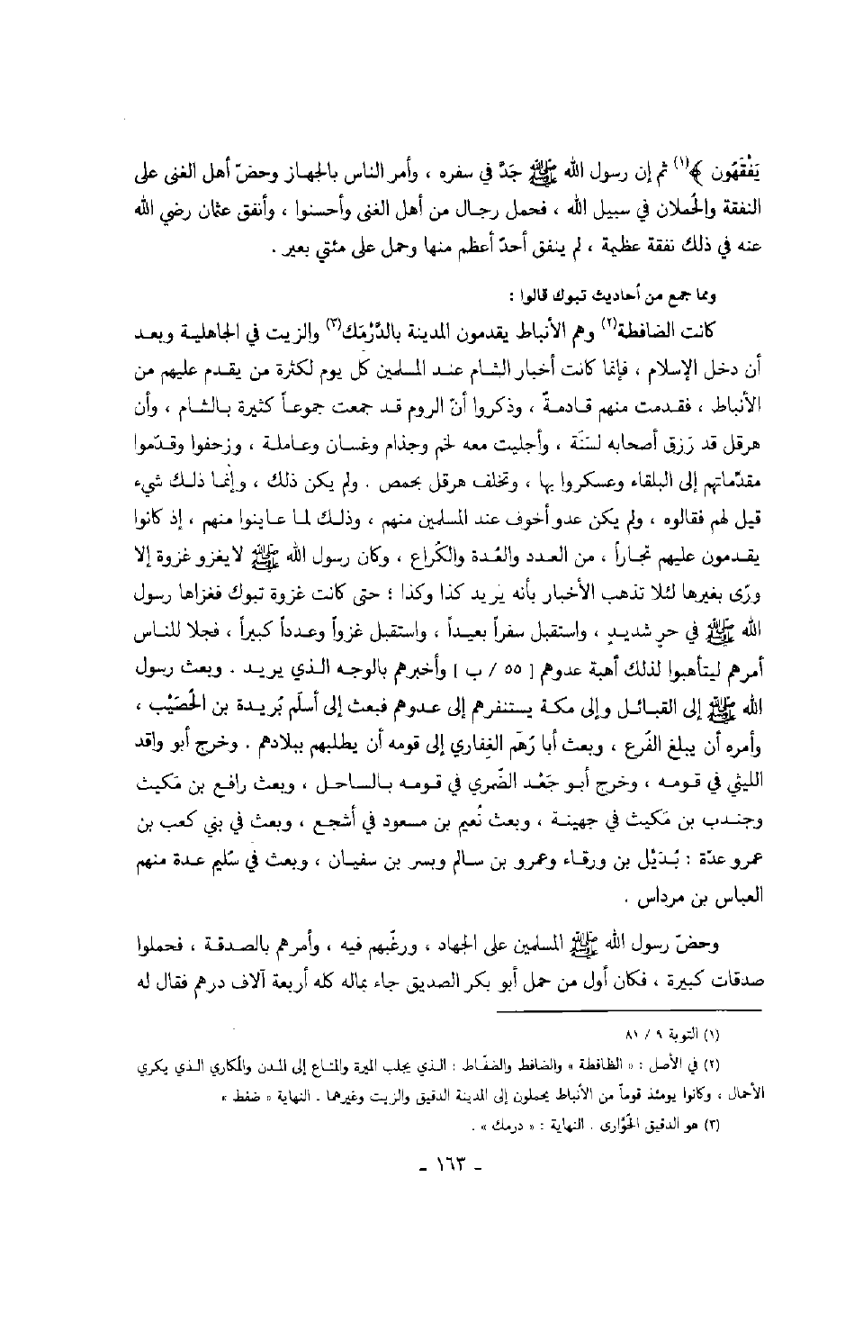 يفقهون " ثم إن رسول الله صَلَّى اللهُ عَلَيْهِ وَسَلَّمَ جد في سفره، وأمر الناس بالجهاز وحض أهل الغنى على النفقة والحملان في سبيل الله، فحمل رجال من أهل الغنى وأحسنوا، وأنفق عثمان رضي الله عنه في ذلك نفقة عظيمة، لم ينفق أحد أعظم منها وحمل على مئتي بعير.