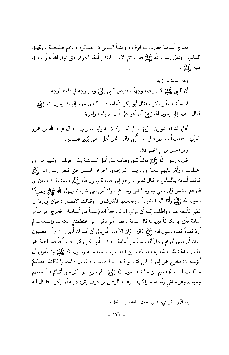 وعن الحسن بن أبي الحسن قال: ضرب رسول الله صَلَّى اللهُ عَلَيْهِ وَسَلَّمَ بعثاً قبل وفاته على أهل المدينة ومن حولهم، وفيهم عمر بن الخطاب، وأمر عليهم أسامة بن زيد. فلم يجاوز أخرهم الخندق حتى قبض رسول الله صَلَّى اللهُ عَلَيْهِ وَسَلَّمَ فوقف أسامة بالناس ثم قال لعمر: ارجع إلى خليفة رسول الله صَلَّى اللهُ عَلَيْهِ وَسَلَّمَ فاستأذنه يأذن لي فأرجع بالناس فإن فعي وجوه الناس وحدهم، ولا آمن على خليفة رسول الله صَلَّى اللهُ عَلَيْهِ وَسَلَّمَ وثقل رسول الله صَلَّى اللهُ عَلَيْهِ وَسَلَّمَ وأثقال المسلمين أن تيخطفهم المشركون. وقالت الأنصار: فإن أبى إلا أن تمضي فأبلغه عنا، واطلب إليه أن يولي أمرنا رجلاً أقدم سناً من أسامة. فخرج عمر بأمر أسامة فأتى أبا بكر فأخبره بما قال أسامة. فقال أبو بكر: لو اختطفتني الكلاب والذئاب لم أرد قضاء قضاه رسول الله صَلَّى اللهُ عَلَيْهِ وَسَلَّمَ قال: فإن الأنصار أمروني أن أبلغك أنهم يطلبون إليك أن تولي أمرهم رجلاً أقدم سناً من أسامة. فوثب أبو بكر وكان جالساً فأخذ بلحية عمر وقال: ثكلتك أمك وعدمتك يا بن الخطاب، استعمله رسول الله صَلَّى اللهُ عَلَيْهِ وَسَلَّمَ وتأمرني أن أنزعه؟! فخرج عمر إلى الناس فقالوا له: ما صنعت؟ فقال: امضوا ثكلتكم أمهاتكم ما لقيت فقي سببكم اليوم من خليفة رسول الله صَلَّى اللهُ عَلَيْهِ وَسَلَّمَ. ثم خرج أبو بكر حتى أتاهم فأشخصهم وشيعهم وهو ماش وأسامة راكب. وعبد الرحمن بن عوف يقود دابة أبي بكر، فقال له