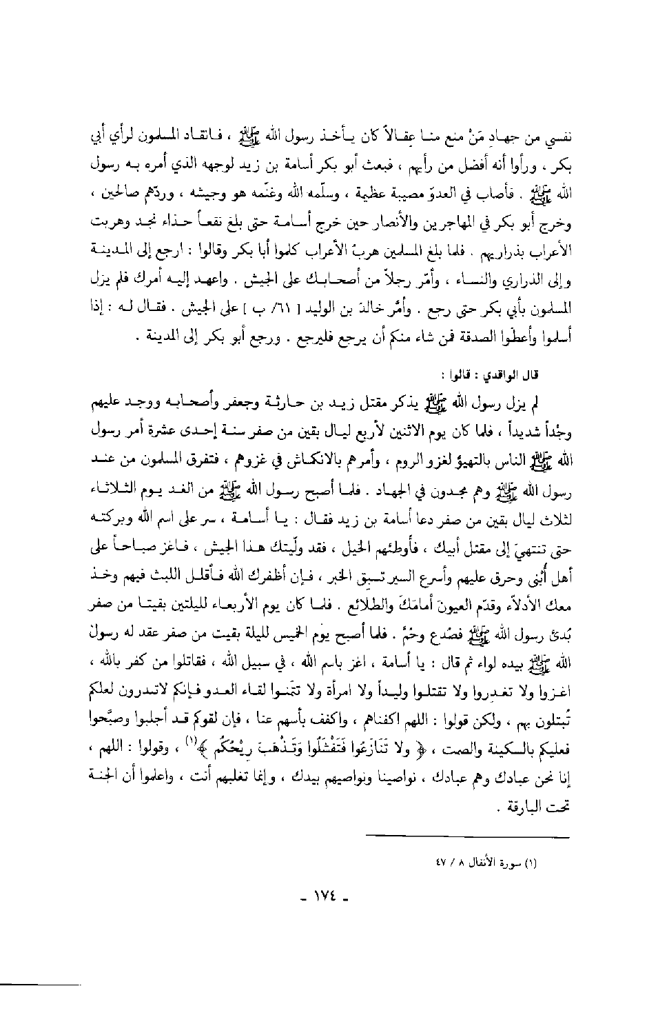 نفسي من جهاد من منع منا عقالاً كان يأخذ رسول الله صَلَّى اللهُ عَلَيْهِ وَسَلَّمَ، فانقاد المسلمون لرأي أبي بكر ورأوا أنه أفضل من رأيهم، فبعث أبو بكر أسامة بن زيد لوجهه الذي أمره به رسول الله صَلَّى اللهُ عَلَيْهِ وَسَلَّمَ. فأصاب في العدو مصيبة عظيمة، وسلمه الله وغنمه هو وجيشه، وردهم صالحين، وخرج أبو بكر في المهاجرين والأنصار حين خرج أسامة حتى بلغ نقعاً حذاء نجد وهربت الأعراب بذراريهم. فلما بلغ المسلمين هرب الأعراب كلموا أبا بكر وقالوا: ارجع إلى المدينة وإلى الذراري والنساء، وأمر رجلاً من أصحابك على الجيش. واعهد إليه أمرك فلم يزل المسلمون بأبي بكر حتى رجع. وأمر خالد بن الوليد على الجيش. فقال له: إذا أسلموا وأعطوا الصدقة فمن شاء منكم أن يرجع فليرجع. ورجع أبو بكر إلى المدينة.