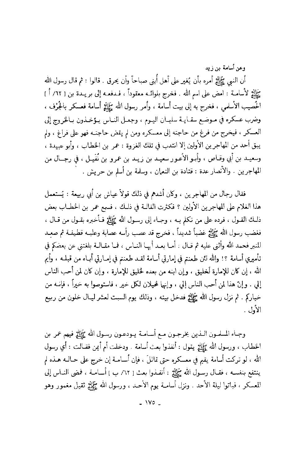 وعن أسامة بن زيد: أن النبي صَلَّى اللهُ عَلَيْهِ وَسَلَّمَ أمره بأن يغير على أهل أبنى صباحاً وأن يحرق. قالوا: ثم قال رسول الله صَلَّى اللهُ عَلَيْهِ وَسَلَّمَ لأسامة: امض على اسم الله. فخرج بلواثه معقوداً، فدفعه إلى بريدة بن الحصيب الأسلمي، فخرج به إلى بيت أسامة، وأمر رسول الله صَلَّى اللهُ عَلَيْهِ وَسَلَّمَ أسامة فعسكر بالجرف، وضرب عسكره في موضع سقاية سليمان اليوم، وجعل الناس يؤخذون بالخروج إلى العسكر، فيخرج من فرغ من حاجته إلى معسكره ومن لم يقض حاجته فهو على فراغ، ولم يبق أحد من المهاجرين الأولين إلا انتدب في تلك الغزوة: عمر بن الخطاب، وأبو عبيدة، وسعيد بن أبي وقاص، وأبو الأعور سعيد بن زيد بن عمرو بن نفيل، في رجال من المهاجرين. والأنصار عدة: قتادة بن النعمان، وسلمة بن أسلم بن حريش.