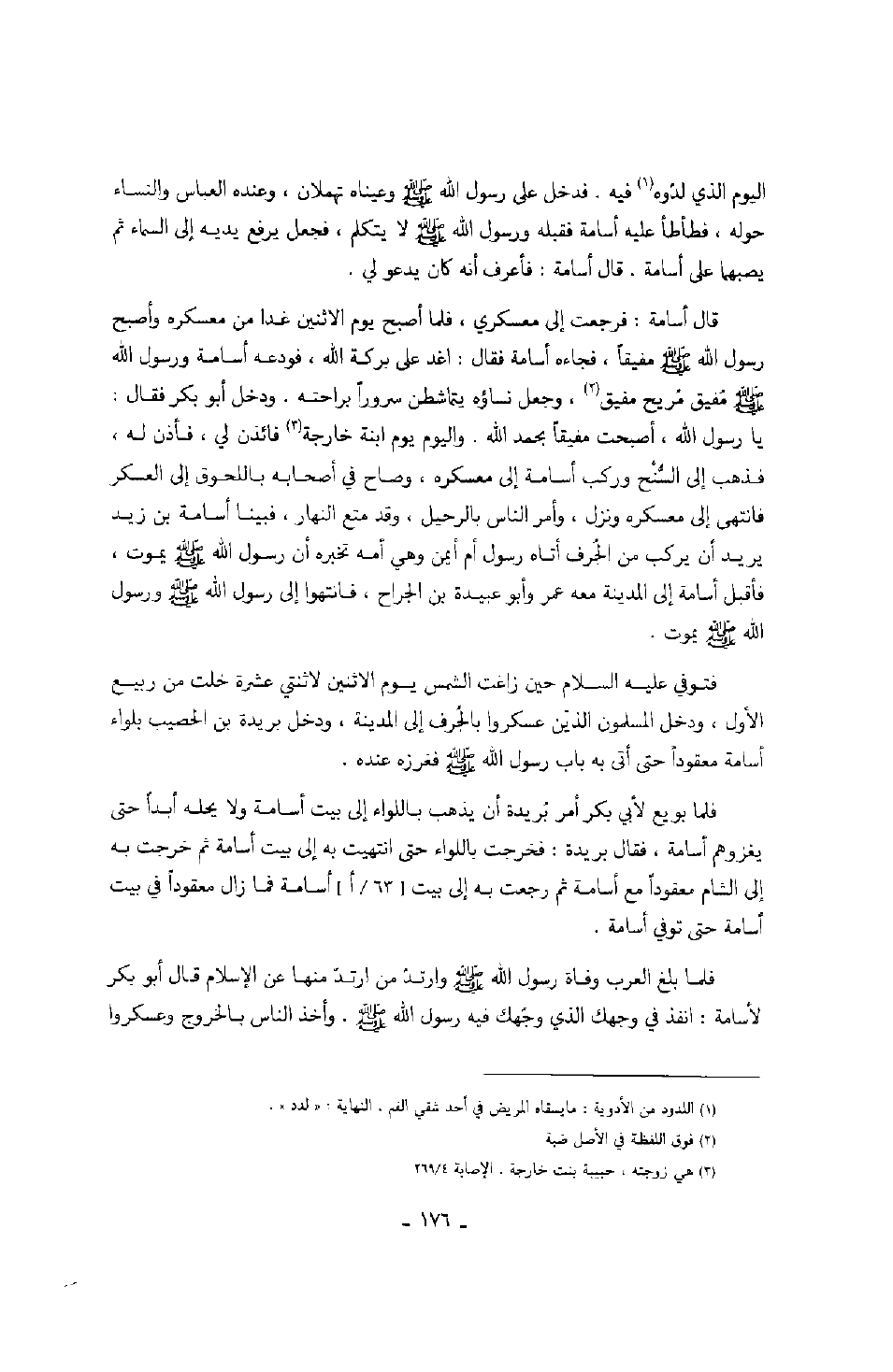 قال أسامة: فرجعت إلى معسكري، فلما أصبح يوم الاثنين غدا من معسكره وأصبح رسول الله صَلَّى اللهُ عَلَيْهِ وَسَلَّمَ مفيقاً، فجاءه أسامة فقال: اغد على بركة الله، فودعه أسامة ورسول الله صَلَّى اللهُ عَلَيْهِ وَسَلَّمَ مفيق مريح مفيق، وجعل نساؤه يتماشطن سروراً براحته. ودخل أبو بكر فقال: يا رسول الله، أصبحت مفيقاً بحمد الله. واليوم يوم ابنة خارجة فإذن لي، فأذن له، فذهب إلى السنح وركب أسامة إلى معسكره، وصاح في أصحابه باللحوق إلى العسكر فانتهى إلى معسكره ونزل، وأمر الناس بالرحيل، وقد متع النهار، فبينا أسامة بن يزد يريد أن يركب من الجرف أتاه رسول أم أيمن وهي أمه تخبره أن رسول الله صَلَّى اللهُ عَلَيْهِ وَسَلَّمَ يموت، فأقبل أسامة إلى المدينة معه عمر وأبو عبيدة بن الجراح، فانتهوا إلى رسول الله صَلَّى اللهُ عَلَيْهِ وَسَلَّمَ ورسوله الله صَلَّى اللهُ عَلَيْهِ وَسَلَّمَ يموت.