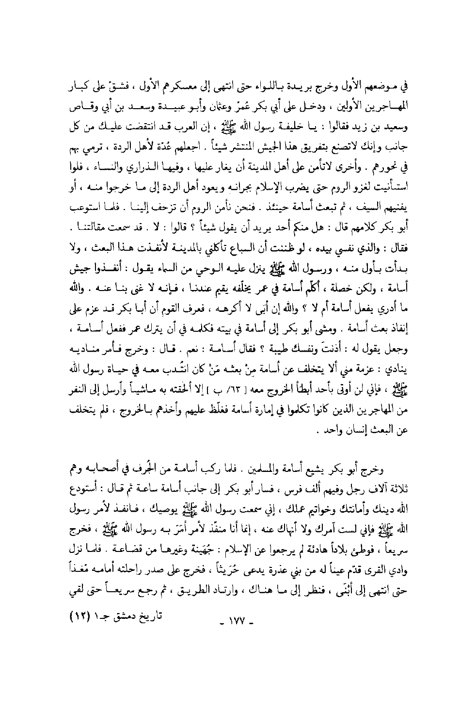 في موضعهم الأول وخرج بريدة باللواء حتى انتهى إلى معسكرهم الأول، فشق على كبار المهاجرين الأولين، ودخل على أبي بكر عمر وعثمان وأبو عبيدة وسعد بن أبي وقاص وسعيد بن زيد فقالوا: يا خليفة رسول الله صَلَّى اللهُ عَلَيْهِ وَسَلَّمَ، إن العرب قد انتقضت عليك من كل جانب وإنك لا تصنع بتفريق هذا الجيش المنتشر شيئاً. اجعلها عدة لأهل الردة، ترمي بهم في نحورهم. وأخرى لا تأمن على أهل المدينة أن يغار عليها، وفيها الذاراري والنساء، فلوا استأنيت لغزو الروم حتى يضرب الإسلام بجرانه ويعود أهل الردة إلى ما خرجوا منه، أو يفنيهم السيف، ثم تبعث أسامة حينئذ. فنحن نأمن الروم أن تزحف إلينا. فلما استوعب أبو بكر كلامهم قال: هل منكم أحد يريد أن يقول شيئاً؟ قالوا: لا. قد سمعت مقالتنا. فقال: والذي نفسي بيده، لو ظننت أن السباع تأكلني بالمدينة لأنفذت هذا البعث، ولا بدأت بأول منه، ورسول الله صَلَّى اللهُ عَلَيْهِ وَسَلَّمَ ينزل عليه الوحي من السماء يقول: أنفذوا جيش أسامة، ولكن خصلة، أكلم أسامة في عمر يخلفه يقيم عندنا، فإنه لا يغنى بنا عنه. والله ما أدري يفعل أسامة أم لا؟ والله إن أبى لا أكرهه، فعرف القوم أن أبا بكر قد عزم على إنفاذ بعث أسامة. ومشى أبو بكر إلى أسامة في بيته فكلمه في أن يترك عمر ففعل أسامة، وجعل يقول له: أذنت ونفسك طيبة؟ فقال أسامة نعم. قال: وخرج فأمر مناديه ينادي: عزمة مني ألا يتخلف عن أسامة من بعثه من كان انتدب معه في حياة رسول الله صَلَّى اللهُ عَلَيْهِ وَسَلَّمَ، فإني لن أوتي بأحد أبطأ الخروج معه إلا ألحقته به ماشياً وأرسل إلى النفر من المهاجرين الذين كانوا تكلموا في إمارة أسامة فغلظ عليهم وأخذهم بالخروج، فلم يتخلف عن البعث إنسان واحد.
