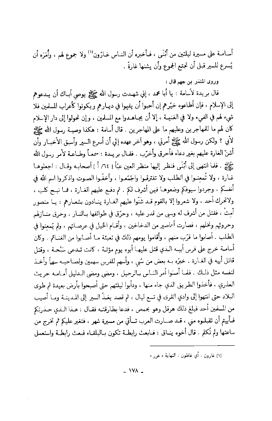 أسامة على مسيرة ليلتين من أبنى، فأخبره أن الناس غارون ولا جموع لهم، وأمره أن يسرع للسير قبل أن تجتمع الجموع وأن يشنها غارة.
