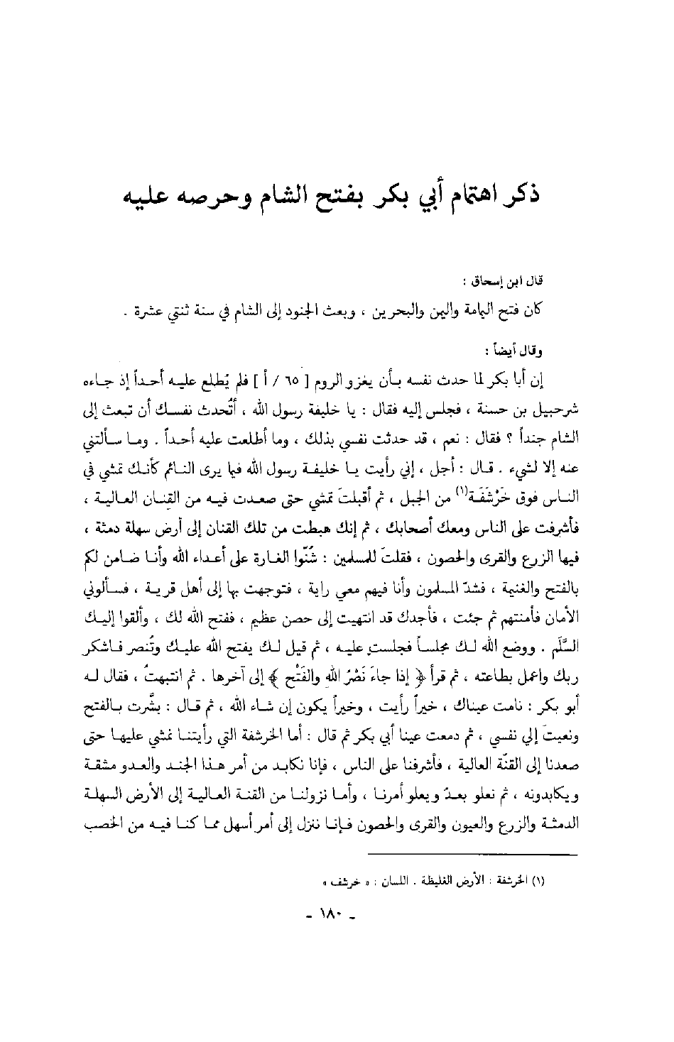 إن أبا بكر لما حدث نفسه بأن يغزو الروم فلم يطلع عليه أحداً إذ جاءه شرحبيل بن حسنة، فجلس إليه فقال: يا خليفة رسول الله، أتحدث نفسك أن تبعث إلى الشام جنداً؟ فقال: نعم، قد حدثت نفسي بذلك، وما أطلعت عليه أحداً. وما سألتني عنه إلا لشيء. قال: أجل، إني رأيت يا خليفة رسول الله فيما يرى النائم كأنك تمشي في الناس فوق خرشفة من الجبل، ثم أقبلت تمشي حتى صعدت فيه من القنان العالية، فأشرفت على الناس ومعك أصحابك، ثم إنك هبطت من تلك القنان إلى أرض سهلة دمثة، فيها الزرع والقرى والحصون، فقلت للمسلمين: شنوا الغارة على أعداء الله وأنا ضامن لكم بالفتح والغنيمة، فشد المسلمون وأنا فيهم معي راية، فتوجهت بها إلى أهل قرية، فسألوني الأمان فأمنتهم ثم جئت، فأجدك قد انتهيت إلى حصن عظيم، ففتح الله لك، وألقوا إليك السلم. ووضع الله لك مجلساً فجلست عليه، ثم قيل لك يفتح الله عليك وتنصر فاشكر ربك واعمل بطاعته، ثم قرأ " إذا جاء نصر الله والفتح " إلى آخرها. ثم انتبهت، فقال له أبو بكر: نامت عيناك، خيراً رأيت، وخيراً يكون إن شاء الله، ثم قال: بشرت بالفتح ونعيت إلي نفسي، ثم دمعت عينا أبي بكر ثم قال: أما الخرشفة التي رأيتنا نمشي عليها حق صعدنا إلى القنة العالية، فأشرفنا على الناس، فإنا نكابد من أمر هذا الجند والعدو مشقة ويكابدونه، ثم نعلو بعد ويعلو أمرنا، وأما نزولنا من القنة العالية إلى الأرض السهلة الدمثة والزرع والعيون والقرى والحصون فإنا ننزل إلى أمر أسهل مما كنا فيه من الخصب