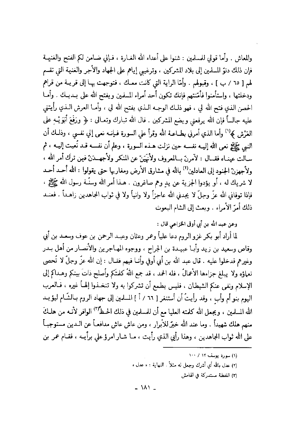 والمعاش. وأما قولي للمسلمين: شنوا على أعداء الله الغارة، فإني ضامن لكم الفتح والغنيمة فإن ذلك دنو المسلمين إلى بلاد المشركين، وترغيبي إياهم على الجهاد والأجر والغنيمة التي تقسم لهم، وقبولهم. وأما الراية التي كانت معك، فتوجهت بها إلى قرية من قراهم ودخلتها، واستأمنوا فأمنتهم فإنك تكون أحد أمراء المسلمين ويفتح الله على يديك. وأما الحصن الذي فتح الله لي، فهو ذلك الوجه الذي يفتح الله لي، وأما العرش الذي رأيتني عليه جالساً فإن الله يرفعني ويضع المشركين. قال الله تبارك وتعالى: " ورفع أبويه على العرش " وأما الذي أمرني بطاعة الله وقرأ علي السورة فإنه نعى إلي نفسي، وذلك أن النبي صَلَّى اللهُ عَلَيْهِ وَسَلَّمَ نعى الله إليه نفسه حين نزلت هذه السورة، وعلم أن نفسه قد نعيت إليه، ثم سألت عينا فقال: لآمرن بالمعروف ولأنهين عن المنكر ولأجهدن فيمن ترك أمر الله، ولأجهزن الجنود إلى العادلين بالله في مشارق الأرض ومغاربها حتى يقولوا: الله أحد أحد لا شريك له، أو يؤدوا الجزية عن يد وهم صاغرون. هذا أمر الله وسنة رسول الله صَلَّى اللهُ عَلَيْهِ وَسَلَّمَ فإذا توفاني الله عز وجل لا يجدني الله عاجزاً ولا وانياً ولا في ثواب المجاهدين زاهداً. فعند ذلك أمر الأمراء. وبعث إلى الشام البعوث.