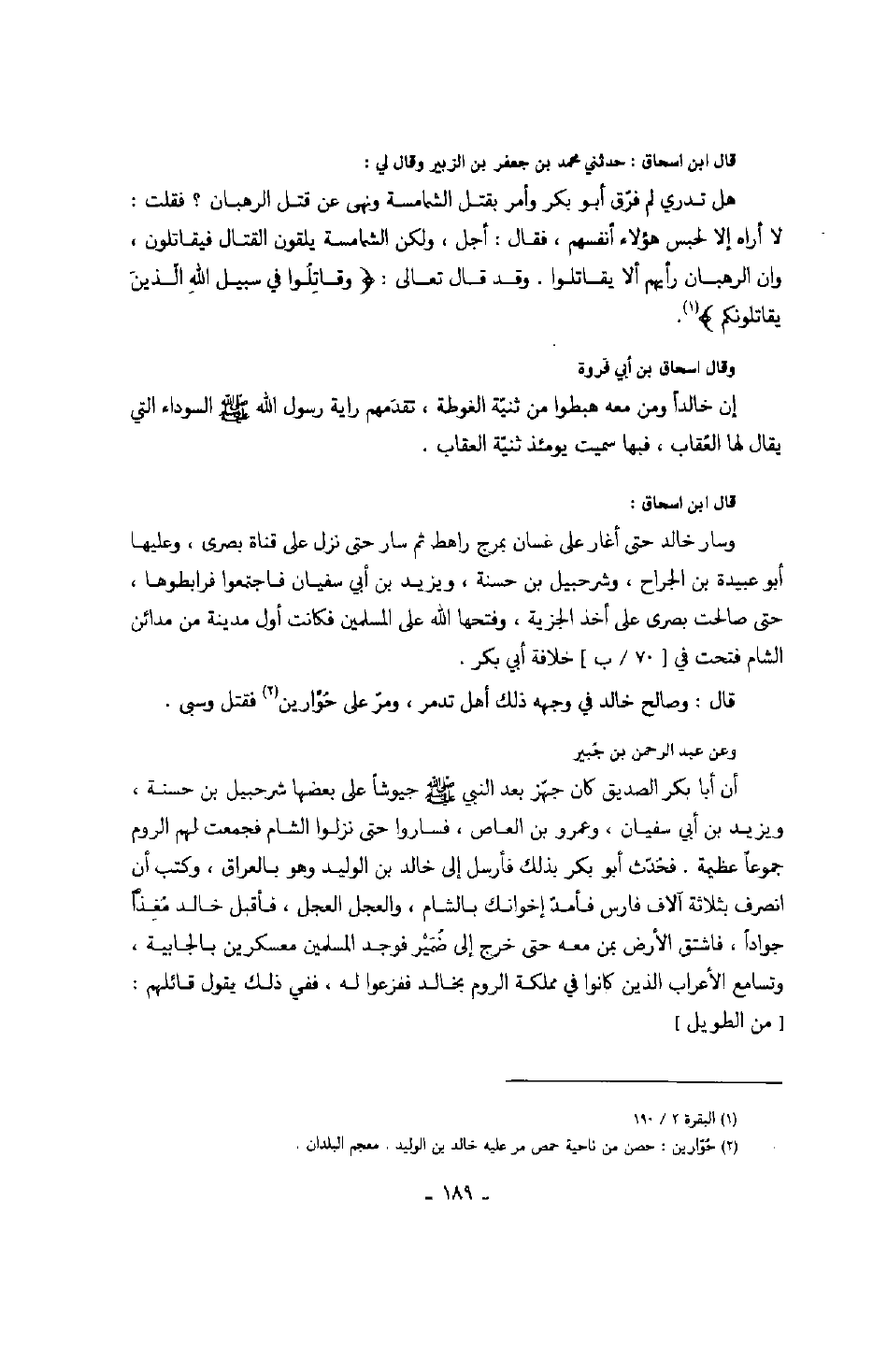 قال ابن إسحاق: حدثني محمد بن جعفر بن الزبير وقال لي: هل تدري لم فرق أبو بكر وأمر بقتل الشمامسة يلقون القتال فيقاتلون، وأن الرهبان رأيهم ألا يقاتلوا. وقد قال تعالى: " وقاتلوا في سبيل الله الذين يقاتلونكم ".