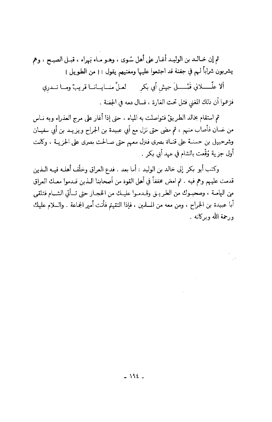 وكتب أبو بكر إلى خالد بن الوليد: أما بعد. فدع العراق وخلف أهله فيه الذين قدمت عليهم وهم فيه. ثم امض مخففاً في أهل القوة من أصحابنا الذين قدموا معك العراق من اليمامة، وصحبوك من الطريق وقدموا عليك من الحجاز حتى تأتي الشام فتلقي أبا عبيدة بن الجراح، ومن معه من المسلمين، فإذا التقيتم فأنت أمير الجماعة. والسلام عليك ورحمة الله وبركاته.