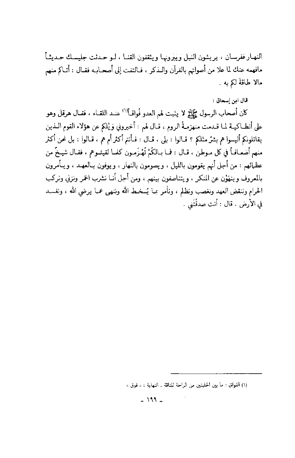 قال ابن إسحاق: كان أصحاب رسول الله صَلَّى اللهُ عَلَيْهِ وَسَلَّمَ لا يثبت لهم العدو فواقاً عند اللقاء، فقال هرقل وهو على أنطاكية لما قدمت منهزمة الروم، قال لهم: أخبروني ويلكم عن هؤلاء القوم الذين يقاتلونكم أليسوا هم بشر مثلكم؟ قالوا: بلى، قال: فأنتم أكثر أم هم، قالوا: بل نحن أكثر منهم أضعافاً في كل موطن، قال: فما بالكم تهزمون كما لقيتموهم، فقال شيخ من عظمائهم: من أجل أنهم يقومون بالليل، ويصومون بالنهار، ويوفون بالعهد، ويأمرون بالمعروف وينهون عن المنكر، ويتناصفون بينهم، ومن أجل أنا نشرب الخمر ونزني ونركب الحرام وننقض العهد ونغصب ونظلم، ونأمر بما يسخط الله وننهي عما يرضي الله، ونفسد في الأرض. قال: أنت صدقتني.