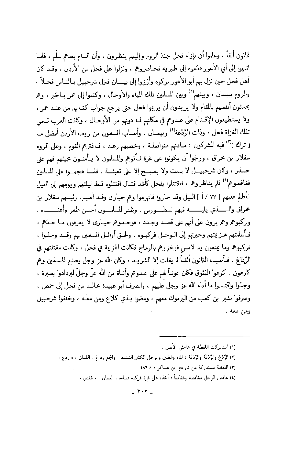 ثمانون ألفاً، وعلموا أن بإزاء فحل جند الروم وإليهم ينظرون، وأن الشام بعدهم سلم، فلما انتهوا إلى أبي الأعور فقدموه إلى طبرية فحاصروهم، ونزلوا على فحل من الأردن، وقد كان أهل فحل حين نزل بهم أبو الأعور تركوه وأرزوا إلى بيسان فنزل شرحبيل بالناس فحلاً، والروم ببيسان، وبينهم وبين المسلمين تلك المياه والأوحال، وكتبوا إلى عمر بالخبر، وهم يحدثون أنفسهم بالمقام ولا يريدون أن يريموا فحل حتى يرجع جواب كتابهم من عند عمر، ولا يستطيعون الإقدام على عدوهم في مكانهم لما دونهم من الأوحال، وكانت العرب تسمي تلك الغزاة فحل، وذات الردغة وبيسان، وأصاب المسلمون من ريف الأردن أفضل ما ترك فيه المشركون: مادتهم متواصلة، وخصبهم رغد، فاغترهم القوم، وعلى الروم سقلار بن محرق، ورجوا أن يكونوا على غرة فأتوهم والمسلمون لا يأمنون مجيئهم فهم على حذر، وكان شرحبيل لا يبيت ولا يصبح إلا على تعبئة. فلما هجموا على المسلمين فغافصوهم فلم يناظروهم، فاقتتلوا بفحل كأشد قتال اقتتلوه قط ليلتهم ويومهم إلى الليل فأظلم عليهم الليل وقد حاروا فانهزموا وهم حيارى وقد أصيب رئيسهم سقلار بن محراق والذي يليه فيهم نطورس، وظفر المسلمون أحسن ظفر وأهناه، وركبوهم وهم يرون على أنهم على قصد وجد، فوجدوهم حيارى لا يعرفون ما حدهم، فأسلمتهم هزيمتهم وحيرتهم إلى الوحل فركبوه، ولحق أوائل المسلمين بهم وقد وحلوا، فركبوهم وما يمنعون يد لامس فوخزوهم بالرماح فكانت الهزيمة في فحل، وكانت مقتلتهم في الرداغ، فأصيب الثمانون ألفاً لم يفلت إلا الشريد، وكن الله عز وجل ليزدادوا بصيرة، وجدوا واقتسموا ما أفاء الله عز وجل عليهم، وانصرف أبو عبيدة بخالد من فحل إلى حمص، وصرفوا بشير بن كعب من اليرموك معهم، ومضوا بذي كلاع ومن معه، وخلفوا شرحبيل ومن معه.