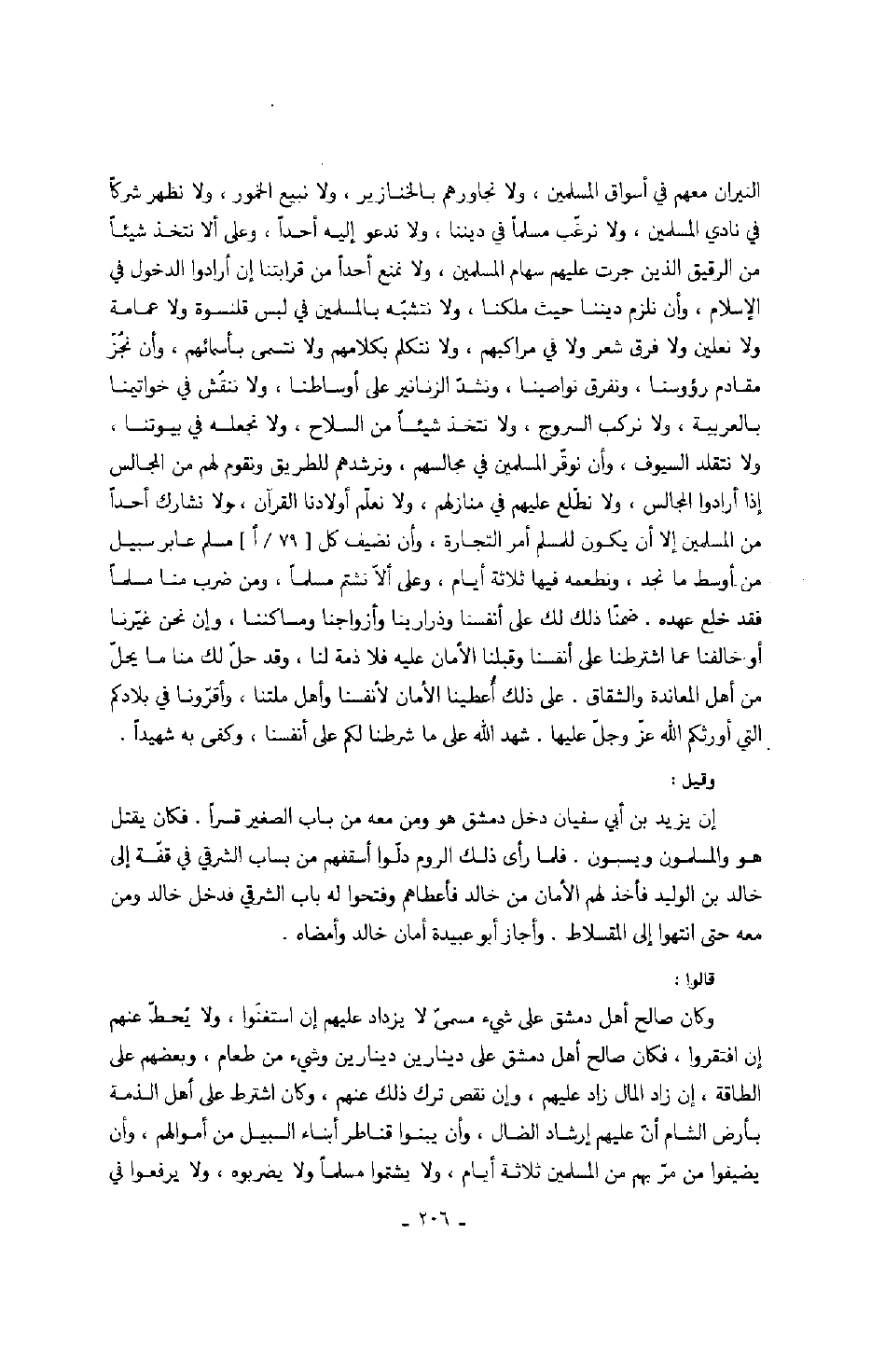 النيران معهم في أسواق المسلمين، ولا نجاورهم بالخنازير، ولا نبيع الخمور، ولا نظهر شركاً في نادي المسلمين، ولا نرغب مسلماً في ديننا، ولا ندعو إليه أحداً، وعلى ألا نتخذ شيئاً من الرقيق الذين جرت عليهم سهام المسلمين، ولا نمنع أحداً من قرابتنا إن أرادوا الدخول في الإسلام، وأن نلزم ديننا حيث ملكنا، لوات نتشبه بالمسلمين في لبس قلنسوة ولا عمامة ولا نعلين ولا فرق شعر ولا في مراكبهم، ولا نتكلم بكلامهم ولا نتسمى بأسمائهم، وأن نجز مقادم رؤوسنا، ونفرق نواصينا، ونشد الزنانير على أوساطنا، ولا ننقش في خواتمنا بالعربية، ولا نركب السروج، ولا نتخذ شيئاً من السلاح، ولا نجعله في بيوتنا، ولا نتقلد السيوف، وأن نوقر المسلمين في مجالسهم، ونرشدهم للطريق ونقوم لهم من المجالس إذا أرادوا المجالس، ولا نطلع عليهم في منازلهم، ولا نعلم أولادنا القرآن، ولا نشارك أحداً من المسلمين إلا أن يكون للمسلم أمر التجارة، وأن نضيف كل مسلم عابر سبيل من أوسط ما نجد، ونطعمه فيها ثلاثة أيام، وعلى ألا نشتم مسلماً، ومن ضرب منا مسلماً فقد خلع عهده. ضمنا ذلك لك على أنفسنا وذرارينا وأزواجنا ومساكننا، وإن نحن غيرنا أو خالفنا عما اشترطنا على أنفسنا وقبلنا الأمان عليه فلا ذمة لنا، وقد حل لك منا ما يحل من أهل المعاندة والشقاق. على ذلك أعطينا الأمان لأنفسنا وأهل ملتنا، وأقرونا في بلادكم التي أورثكم الله عز وجل عليها. شهد الله على ما شرطنا لكم على أنفسنا، وكفى به شهيداً.