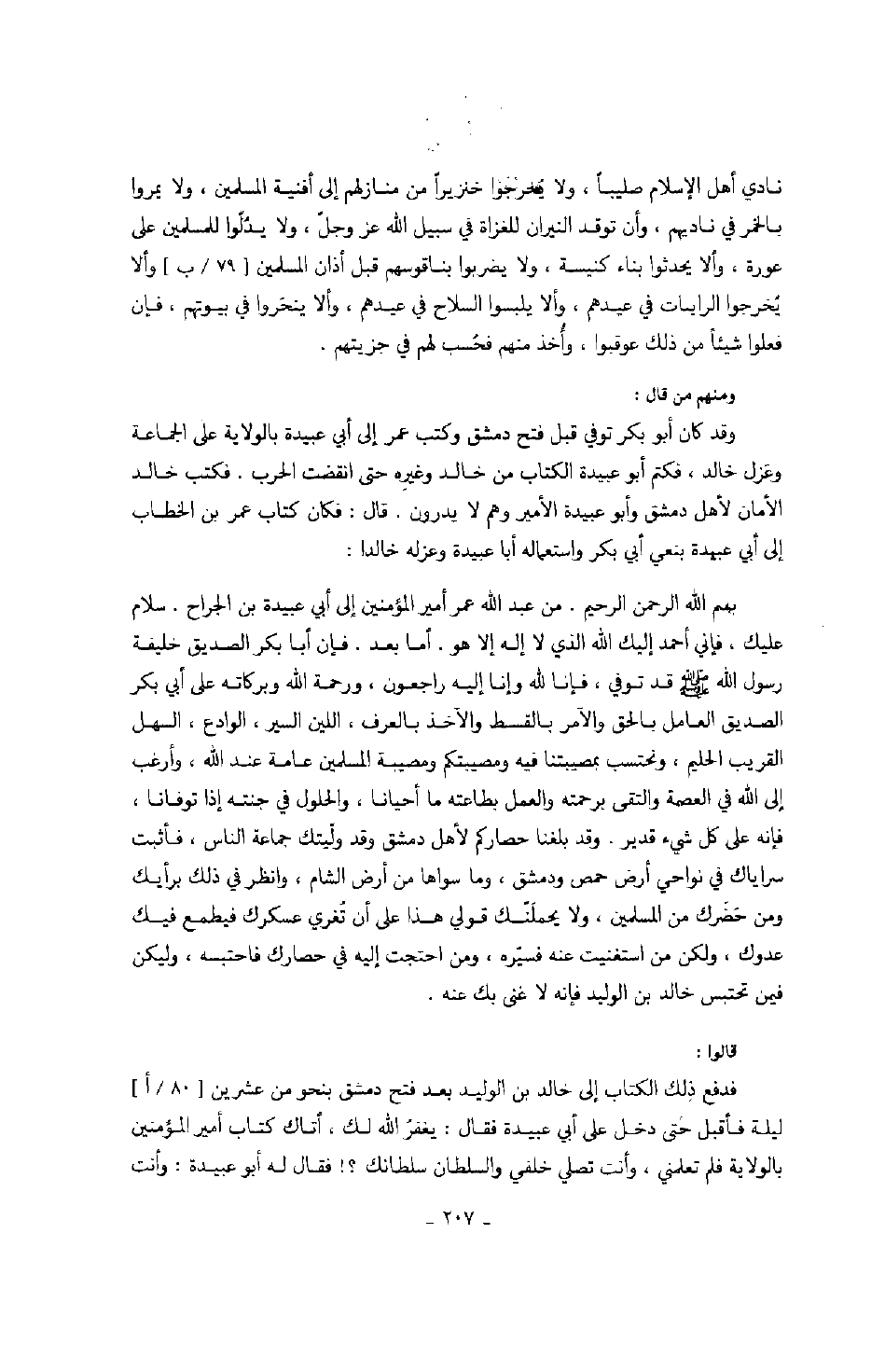 بسم الله الرحمن الرحيم: من عبد الله عمر أمير المؤمنين إلى عبيدة بن الجراح. سلام عليك، فإني أحمد إليك الله الذي لا إله إلا هو. أما بعد. فإن أبا بكر الصديق خليفة رسول الله صَلَّى اللهُ عَلَيْهِ وَسَلَّمَ قد توفي، فإنا لله وإنا إليه راجعون، ورحمة الله وبركاته على أبي بكر الصديق العامل بالحق والآمر بالقسط والآخذ بالعرف، اللين السير، الوادع، السهل القريب الحليم، ونحتسب بمصيبتنا فيه ومصيبتكم ومصيبة المسلمين عامة عند الله، وأرغب إلى الله في العصمة والتقى برحمته والعمل بطاعته ما أحيانا، والحلول في جنته إذا توفانا، فإنه لعلى كل شيء قدير. وقد بلغنا حصاركم لأهل دمشق وقد وليتك جماعة الناس، فاثبت سراياك في نواحي أرض حمص ودمشق، وما سواها من أرض الشام، وانظر في ذلك برأيك ومن حضرك من المسلمين، ولا يحملنك قولي هذا على أن تغري عسكرك فيطمع فيك عدوك، ولكن من استغنيت عنه فسيره، ومن احتجت إليه في حصارك فاحتبسه، وليكن فيمن تحتبس خالد بن الوليد فإنه لا غنى بك عنه.