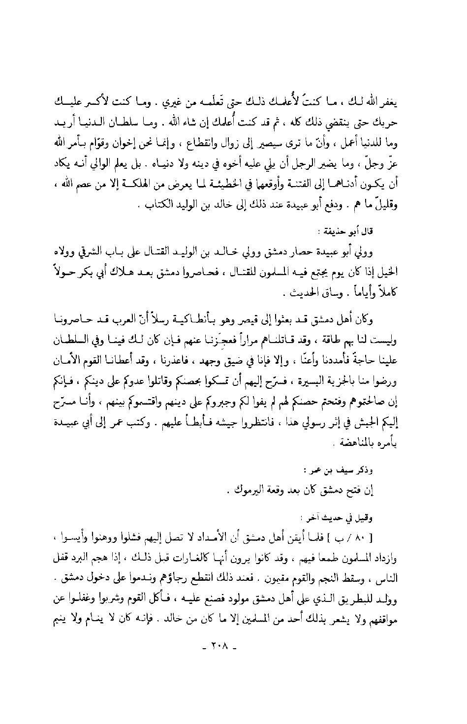 قال أبو حذيفة: وولي أبو عبيدة حصار دمشق وولي خالد بن الوليد القتال على باب الشرقي وولاه الخيل إذا كان يوم يجتمع فيه المسلمون للقتال، فحاصروا دمشق بعد هلاك أبي بكر حولاً كاملاً وأياماً. وساق الحديث.