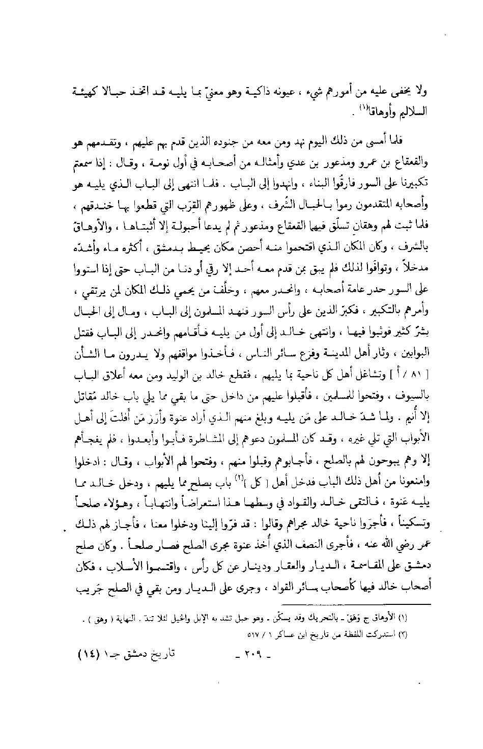 فلما أمسى من ذلك اليوم نهد ومن معه من جنوده الذين قدم بهم عليهم، وتقدمهم هو والقعقاع بن عمرو ومذعور بن عدي وأمثاله من أصحابه في أول نومة، وقال: إذا سمعتم تكبيرنا على السور فارقوا البناء، وانهدوا إلى الباب. فلما انتهى إلى الباب الذي يليه هو وأصحابه المتقدمون رموا بالحبال الشرف، وعلى ظهورهم القرب التي قطعوا بها خندقهم، فلما ثبت لهم وهقان تسلق فيهما القعقاع ومذعور ثم لم يدعا أحبولة إلا أثبتاها، والأوهاق بالشرف، وكان المكان الذي اقتحموا منه أحصن مكان يحيط بدمشق، أكثره ماء وأشده مدخلاً، وتوافوا لذلك فلم يبق بمن قدم معه أحد إلا رقي أو دنا من الباب حتى إذا استووا على السور حدر عامة أصحابه، وانحدر معهم، وخلف من يحمي ذلك المكان لمن يرتقي، وأمرهم بالتكبير، فكبر الذين على رأس السور فنهد المسلمون إلى الباب، ومال إلى الحبال بشر كثير فوثبوا فيها، وانتهى خالد إلى أول من يليه فأقامهم وانحدر إلى الباب فقتل البوابين، وثار أهل المدينة وفزع سائر النسا، فأخذوا مواقفهم ولا يدرون ما الشأن وتشاغل أهل كل ناحية بما يليهم، فقطع خالد بن الوليد ومن معه أعلاق الباب بالسيوف، وفتحوا للمسلمين، فأقبلوا عليهم من داخل حتى ما بقي مما يلي باب خالد مقاتل إلا أنم. ولما شد خالد على من يليه وبلغ منهم الذي أراد عنوة وأرز من أفلت إلى أهل الأبواب التي تلي غيره، وقد كان المسلمون دعوهم إلى المشاطرة فأبوا وأبعدوا، فلم يفجأهم إلا وهم يبوحون لهم بالصلح، فأجابوهم وقبلوا منهم، وفتحوا لهم الأبواب، وقال: ادخلوا وامنعونا من أهل ذلك الباب فدخل أهل كل باب بصلح مما يليهم، ودخل خالد مما يليه عنوة. فالتقى خالد والقواد في وسطها هذا استعراضاً وانتهاباً، وهؤلاء صلحاً وتسكيناً، فأجروا ناحية خالد مجراهم وقالوا: قد فروا إلينا ودخلوا معنا، فأجاز لهم ذلك عمر رضي الله عنه، فأجرى النصف الذي أخذ عنوة مجرى الصلح فصار صالحاً. وكان صلح دمشق على المقاسمة، الديار والعقار ودينار عن كل رأس، واقتسموا الأسلاب، فكان أصحاب خالد فيها كأصحاب سائر القواد، وجرى على الديار ومن بقي في الصلح جريب