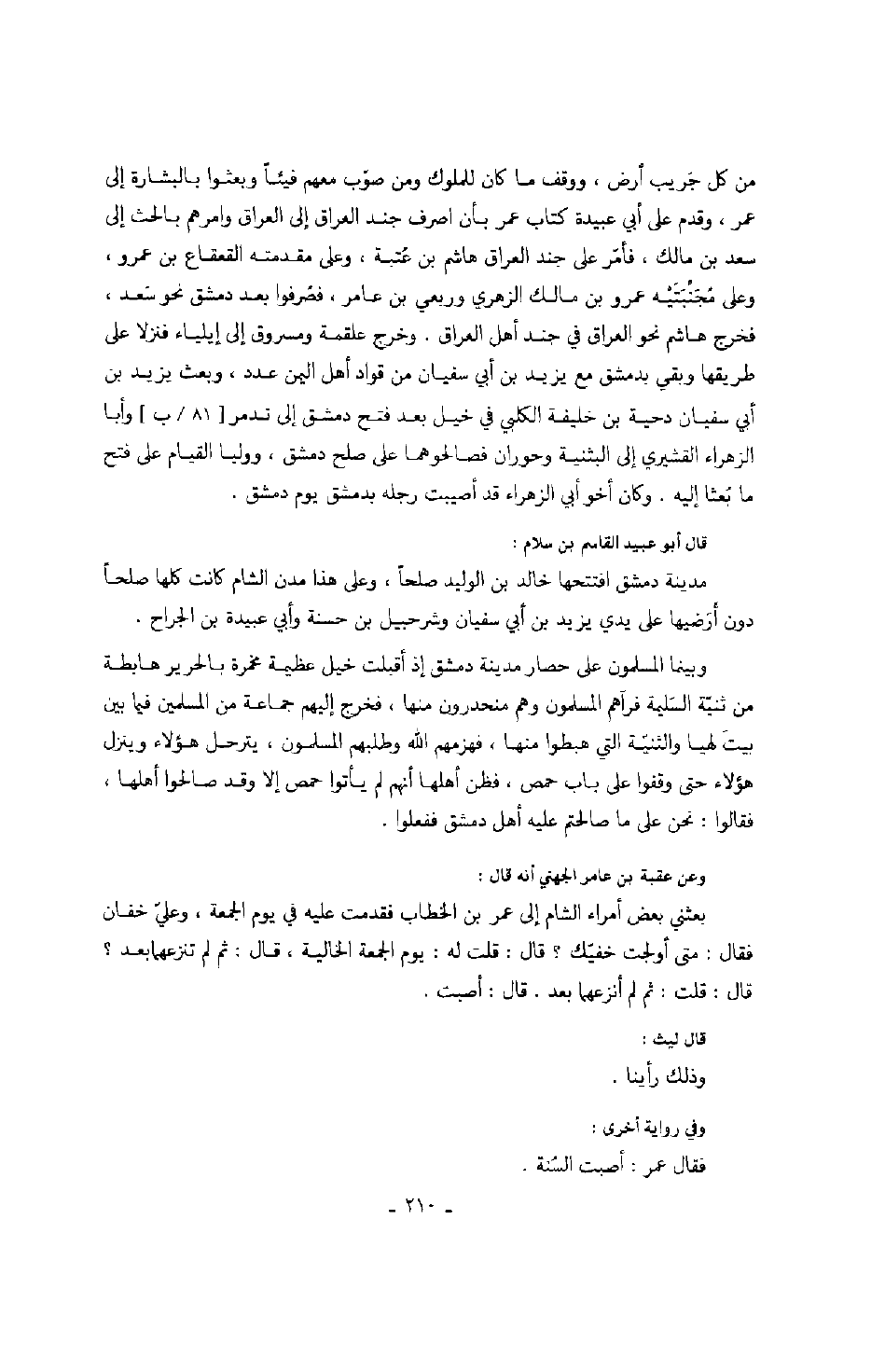 قال أبو عبيد القاسم بن سلام: مدينة دمشق افتتحها خالد بن الوليد صلحاً، وعلى هذا مدن الشام كانت كلها صلحاً دون أرضيا على يدي يزيد بن أبي سفيان وشرحبيل بن حسنة وأبي عبيدة بن الجراح.