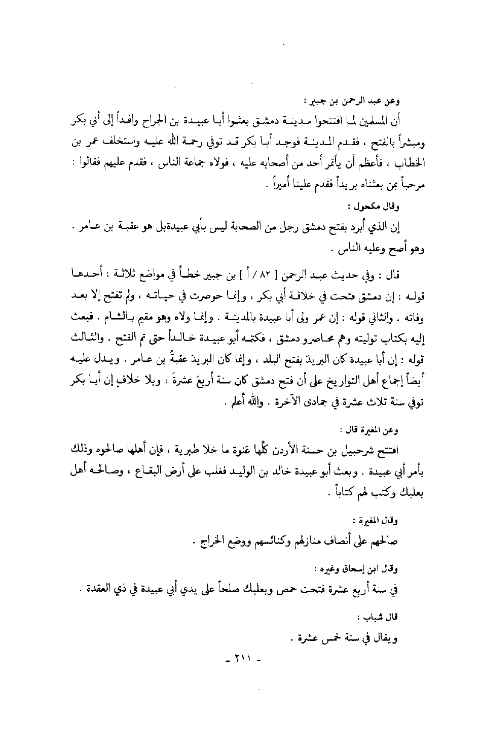 قال: وفي حديث عبد الرحمن بن جبير خطأ في مواضع ثلاثة: أحدها قوله: إن دمشق فتحت في خلافة أبي بكر، وإنما حوصرت في حياته، ولم تفتح إلا بعد وفاته. والثاني قوله: إن عمر ولى أبا عبيدة بالمدينة. وإنما ولاه وهو مقيم بالشام. فبعث إليه بكتاب توليته وهم محاصرو دمشق، فكتمه أبو عبيدة خالداً حتى تم الفتح. والثالث قوله: إن أبا عبيدة كان البريد بفتح البلد، وإنما كان البريد عقبة بن عامر. ويدل عليه أيضاً إجماع أهل التواريخ على أن فتح دمشق كان سنة أربع عشرة، وبلا خلاف إن أبا بكر توفي سنة ثلاث عشرة في جمادى الآخرة. والله أعلم.