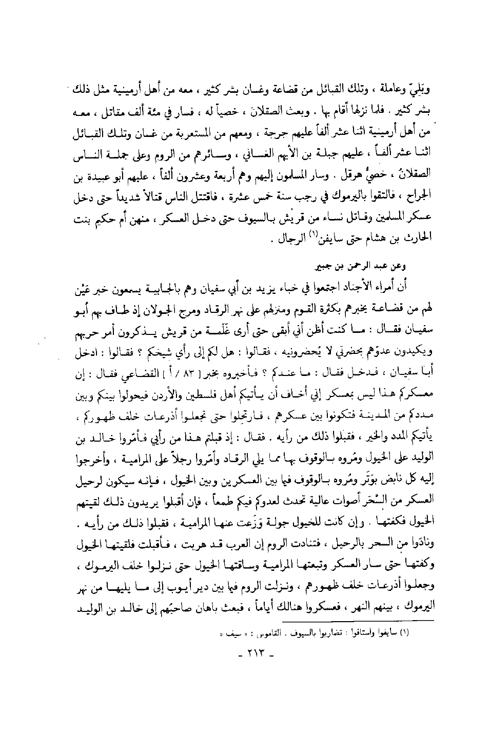 وبلي وعاملة، وتلك القبائل من قضاعة وغسان بشر كثير، معه من أهل أرمينية مثل ذلك بشر كثير،. فلما نزلها أقام بها. وبعث الصقلان، خصياً له، فسار في مئة ألف مقاتل، معه من أهل أرمينية اثنا عشر ألفاً عليهم جرجة، ومعهم من المستعربة من غسان وتلك القبائل اثنا عشر ألفاً، عليهم جبلة بن الأيهم الغساني، وسائرهم من الروم وعلى جملة الناس الصقلان، خصي هرقل. وسار المسلمون إليهم وهم أربعة وعشرون ألفاً، عليهم أبو عبيدة بن الجراح، فالتقوا باليرموك في رجب سنة خمس عشرة، فاقتتل الناس قتالاً شديداً حتى دخل عسكر المسلمين وقاتل نساء من قريش بالسيوف حتى دخل العسكر، منهن أم حكيم بنت الحارث بن هشام حتى سايفن الرجال.