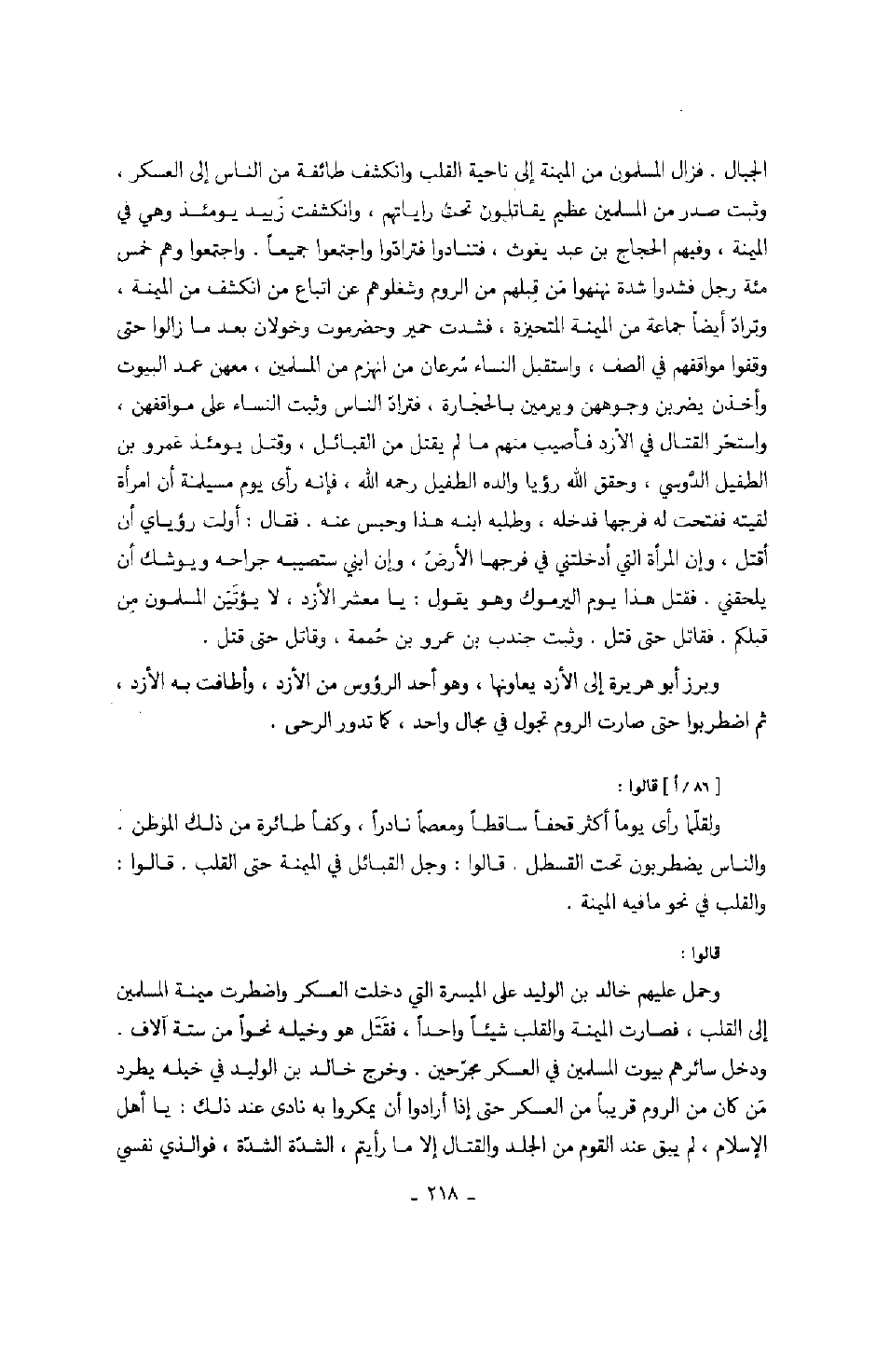 الجبال. فزال المسلمون من الميمنة إلى ناحية القلب وانكشف طائفة من الناس إلى العسكر. وثبت صدر من المسلمين عظيم يقاتلون تحت راياتهم، وانكشفت زبيد يومئذ وهي في الميمنة، وفيهم الحجاج بن عبد يغوث، فتنادوا فترادوا واجتمعوا جميعاً. واجتمعوا وهم خمس مئة رجل فشدوا شدة نهنهوا من قبلهم من الروم وشغلوهم عن اتباع من انكشف من الميمنة. وتراد أيضاً جماعة من الميمنة المتحيزة، فشدت حمير وحضرموت وخولان بعد ما زالوا حتى وقفوا مواقفهم في الصف، واستقبل النساء سرعان من انهزم من المسلمين، معهن عمد البيوت وأخذن يضربن وجوههن ويرمين بالحجارة، فتراد الناس وثبت النساء على مواقفهن، واستحر القتال في الأزد فأصيب منهم ما لم يقتل من القبيائل، وقتل يومئذ عمرو بن الطفيل الدوسي، وحقق الله رؤيا والده الطفيل رحمه الله، فإنه رأى يوم مسيلمة أن امرأة لقيته ففتحت له فرجها فدخله، وطلبه ابنه هذا وحبس عنه. فقال: أولت رؤياي أن أقتل، وإن المرأة التي أدخلتني في فرجها الأرض، وإن ابني ستصيبه جراحة ويوشك أن يلحقني. فقتل هذا يوم اليرموك وهو يقول: يا معشر الأزد، لا يؤتين المسلمون من قبلكم. فقاتل حتى قتل. وثبت جندب بن عمرو بن حممة، وقاتل حتى قتل.