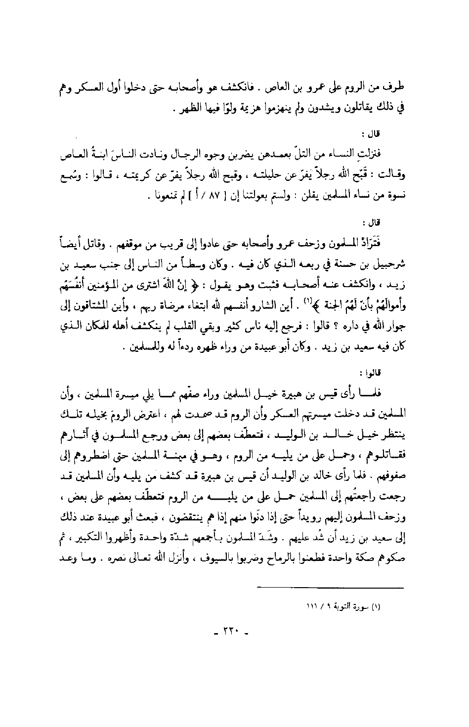 قال: فتراد المسلمون وزحف عمرو وأصحابه حتى عادوا إلى قريب من موقفهم. وقاتل أيضاً شرحبيل بن حسنة في ربعه الذي كان فيه. وكان وسطاً من الناس إلى جنب سعيد بن زيد، وانكشف عنه أصحابه فثبت وهو يقول: " إن الله اشترى من المؤمنين أنفسهم وأموالهم بأن لهم الجنة ". أين الشارو أنفسهم لله ابتغاء مرضاة ربهم، وأين المشتاقون إلى جوار الله في جاره؟ قالوا: فرجع إليه ناس كثير وبقي القلب لم ينكشف أهله للمكان الذي كان فيه سعيد بن زيد. وكان أبو عبيدة من وراء ظهره ردءاً له وللمسلمين.