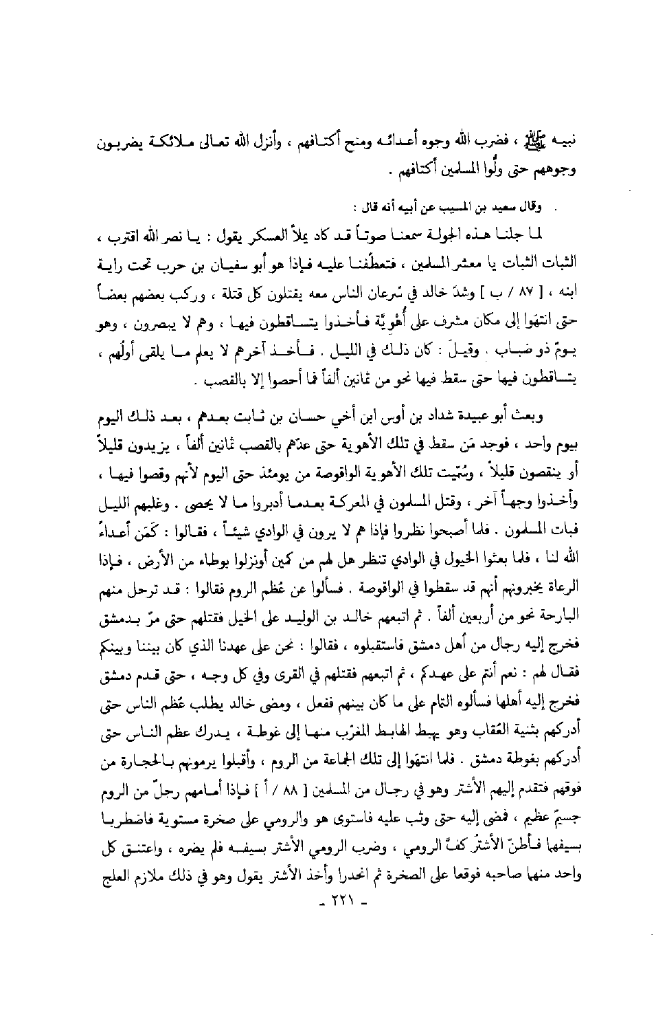 وقال سعيد بن المسيب عن أبيه أنه قال: لما جلنا هذه الجولة سمعنا صوتاً قد كاد يملأ العسكر يقول: يا نصر الله اقترب، الثبات الثبات يا معشر المسلمين، فتعطفنا عليه فإذا هو أبو سفيان بن حرب تحت راية ابنه، وشد خالد في سرعان الناس معه يقتلون كل قتلة، وركب بعضهم بعضاً حتى انتهوا إلى مكان مشرف على أهوية فأخذوا يتساقطون فيها، وهم لا يبصرون، وهو يوم ذو ضباب. وقيل: كان ذلك في الليل. فأخذ آخرهم لا يعلم ما يلقى أولهم، يتساقطون فيها حتى سقط فيها نحو من ثمانين ألفاً فما أحصوا إلا بالقصب.