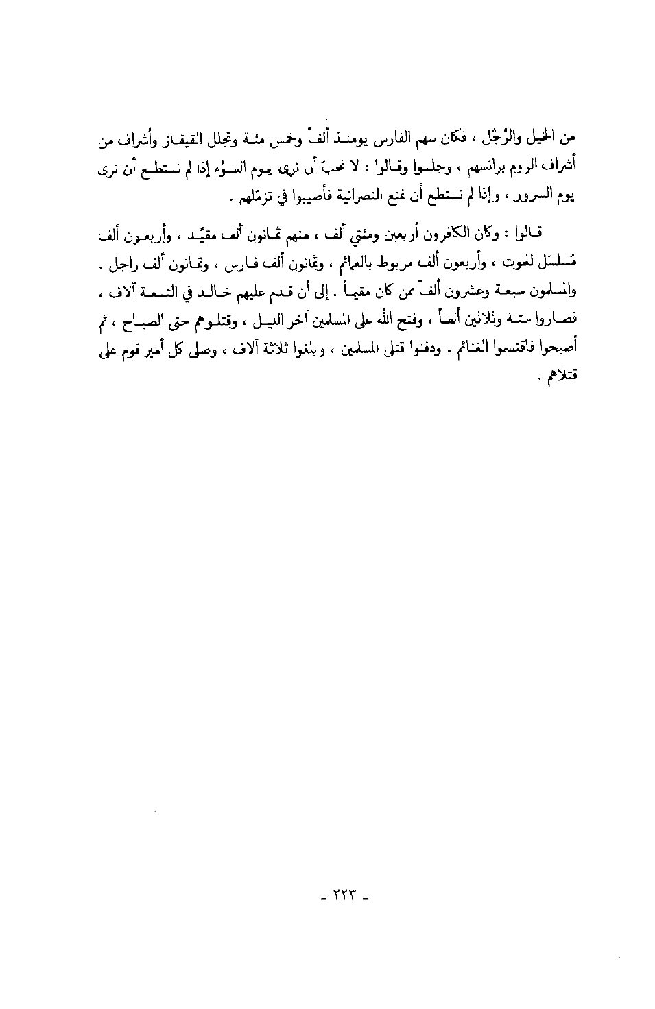 قالوا: وكان الكافرون أربعين ومئتي ألف، منهم ثمانون ألف مقيد، وأربعون ألف مسلسل للموت، وأربعون ألف مربوط بالعمائم، وثمانون ألف فارس، وثمانون ألف راجل. والمسلمون سبعة وعشرون ألفاً ممن كان مقيماً. إلى أن قدم عليهم خالد في التسعة آلاف، فصاروا ستة وثلاثين ألفاً ممن كان مقيماً. إلى أن قدم عليهم خالد في التسعة آلاف، فصاروا ستة وثلاثين ألفاً، وفتح الله على المسلمين آخر الليل، وقتلوهم حتى الصباح، ثم أصبحوا فاقتسموا الغنائم، ودفنوا قتلى المسلمين، وبلغوا ثلاثة آلاف، وصلى كل أمير قوم على قتلاهم.