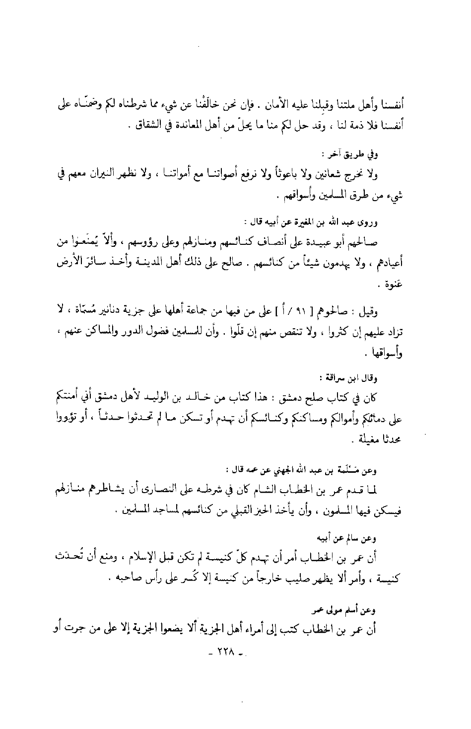 وعن سالم عن أبيه أن عمر بن الخطاب أمر أن تهدم كل كنيسة لم تكن قبل الإسلام، ومنع أن تحدث كنيسة، وأمر ألا يظهر صليب خارجاً من كنيسة إلا كسر على رأس صاحبه.