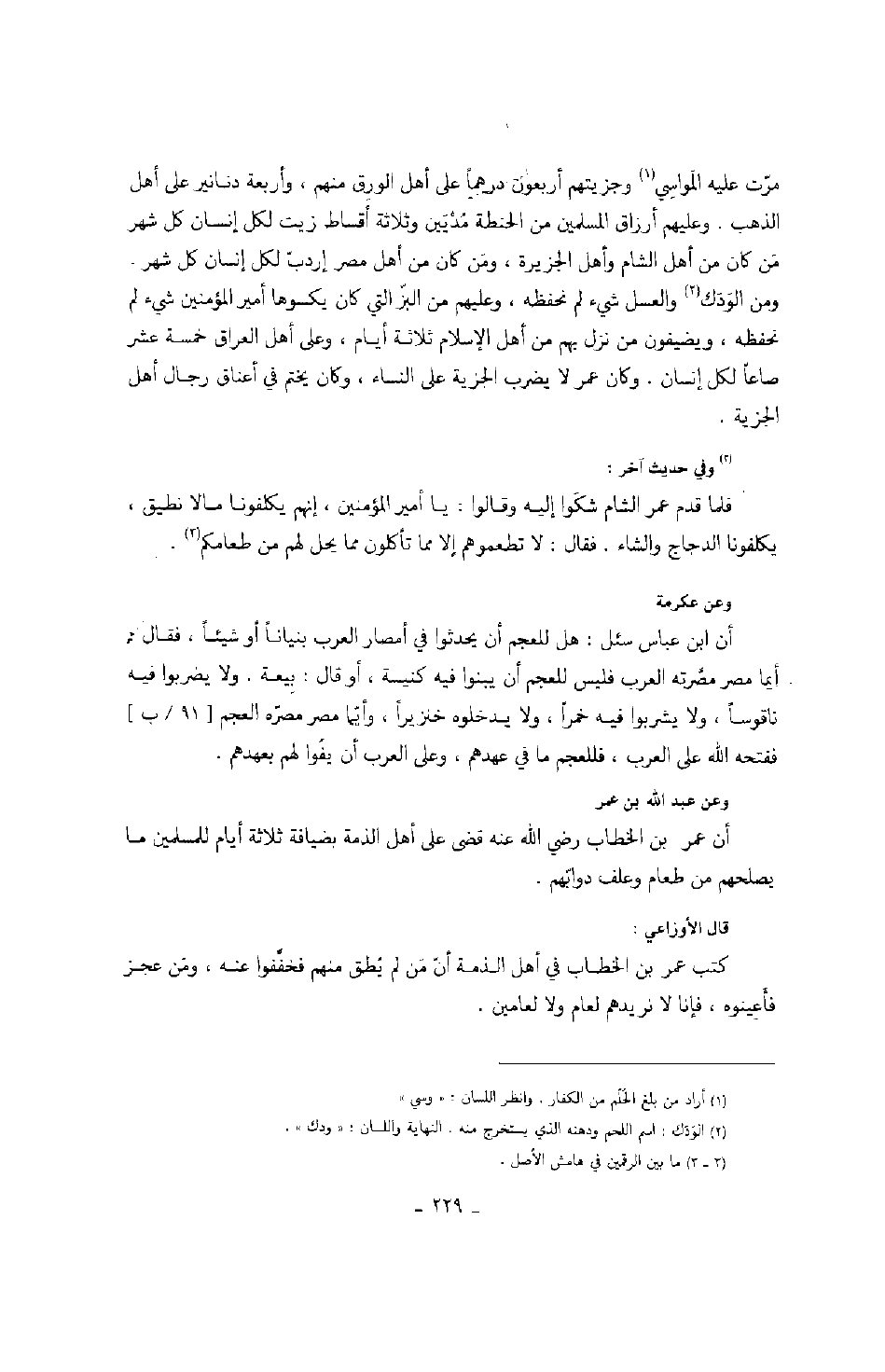 مرت عليه المواسي وجزيتهم أربعون درهماً على أهل الورق منهم، وأربعة دنانير على أهل الذهب. وعليهم أرزاق المسلمين من الحنطة مديين وثلاثة أقساط زيت لكل إنسان كل شهر من كان من أهل الشام وأهل الجزيرة، ومن كان من أهل مصر إردب لكل إنسان كل شهر. ومن الودك والعسل شيء لم نحفظه، وعليهم من البز التي كان يكسوها أمير المؤمنين شيء لم نحفظه، ويضيفون من نزل بهم من أهل الإسلام ثلاث أيام، وعلى أهل العراق خمسة عشر صاعاً لكل إنسان. وكان عمر لا يضرب الجزية على النساء، وكان يختم في أعناق رجال أهل الجزية.