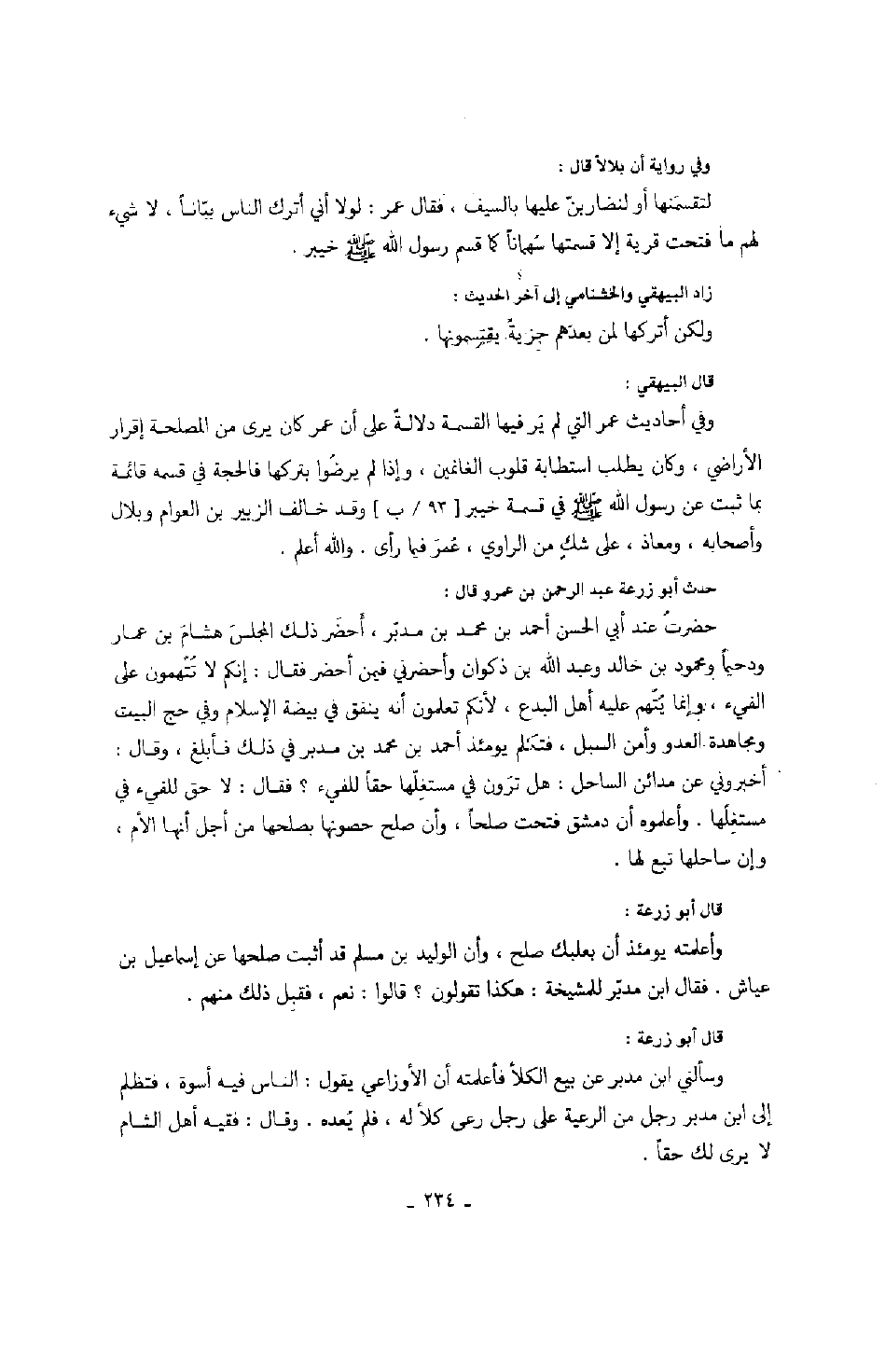 وفي رواية أن بلالاً قال: لتقسمنها أو لنضاربن عليها بالسيف، فقال عمر: لولا أني أترك الناس بباناً، لا شيء لهم ما فتحت قرية إلا قسمتها سهماناً كما قسم رسول الله صَلَّى اللهُ عَلَيْهِ وَسَلَّمَ خيبر.