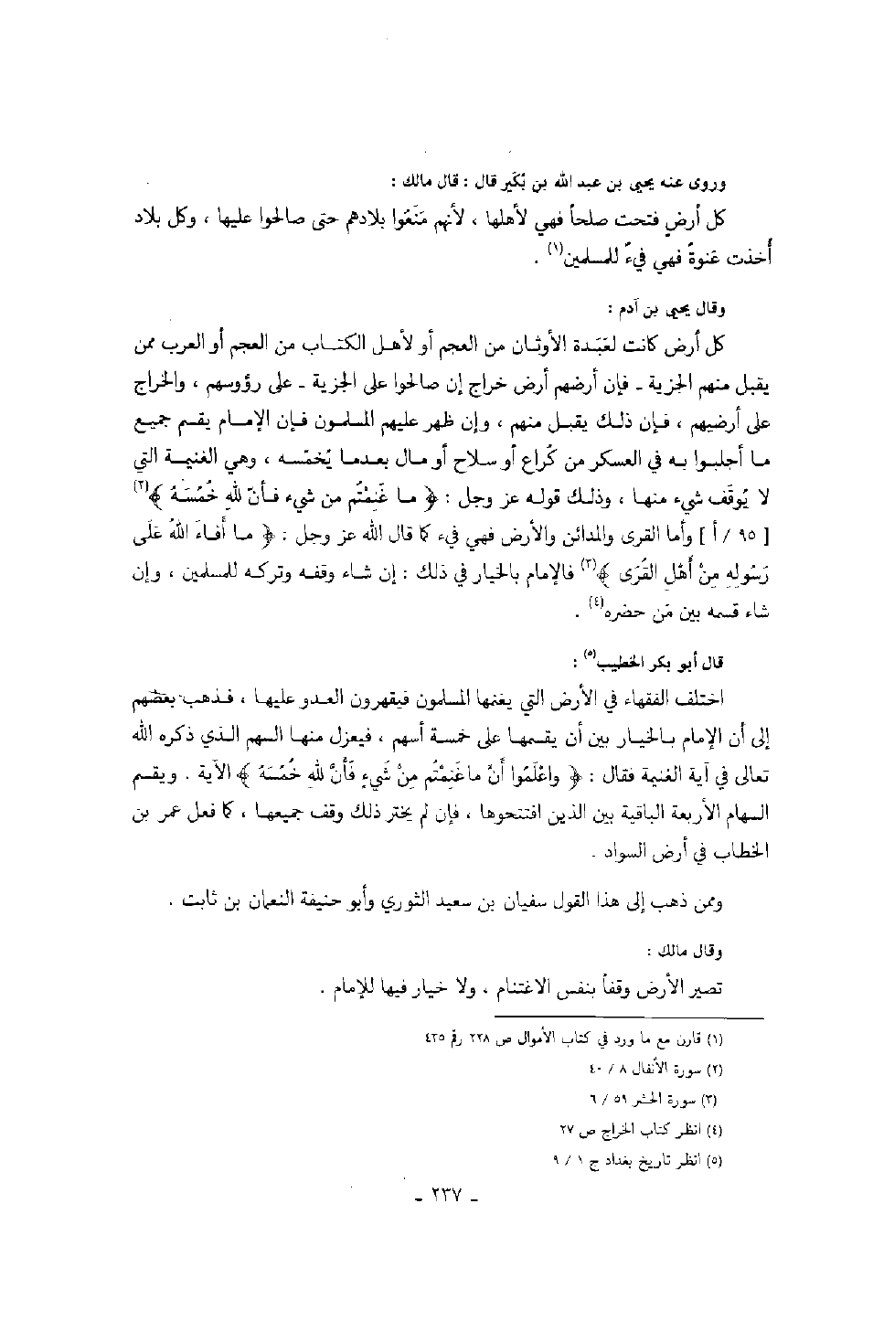 وقال يحيى بن آدم: كل أرض كانت لعبد الأوثان من العجم أو لأهل الكتاب من العجم أو العرب ممن يقبل منهم الجزية فإن أرضهم أرض خراج إن صالحوا على الجزية على رؤوسهم، والخراج على أرضيهم، فإن ذلك يقبل منهم، وإن ظهر عليهم المسلمون فإن الإمام يقسم جميع ما أجلبوا به في العسكر من كراع أو سلاح أو مال بعدما يخمسه، وهي الغنيمة التي لا يوقف شيء منها، وذلك قوله عز وجل: " ما غنمتم من شيء فإن لله خمسه " وأما القرى والمدائن والأرض فهي فيء كما قال الله عز وجل: " ما أفاء الله على رسوله من أهل القرى " فالإمام بالخيار في ذلك: إن شاء وقفه وتركه للمسلمين، وإن شاء قسمه بين حضره.