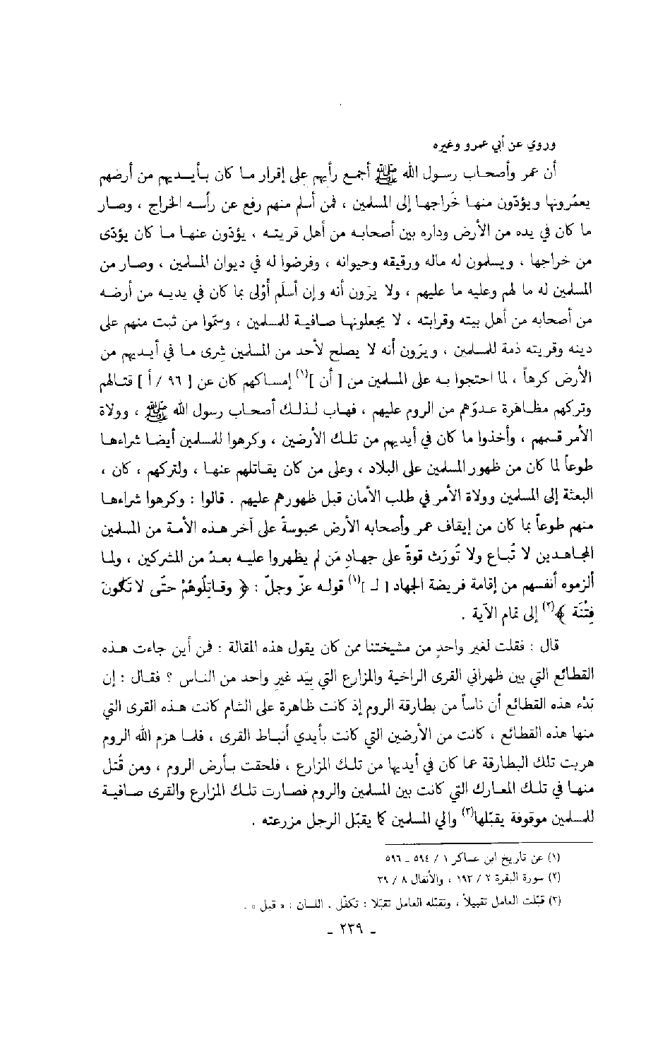 وروي عن أبي عمرو وغيره أن عمر وأصحاب رسول الله صَلَّى اللهُ عَلَيْهِ وَسَلَّمَ أجمع رأيهم على إقرار ما كان بأيديهم من أرضهم يعمرونها ويؤدون منها خراجها إلى المسلمين، فمن أسلم منهم رفع عن رأسه الخراج، وصار ما كان في يده من الأرض وداره بين أصحابه من أهل قريته، يؤدون عنها ما كان يؤدى من خراجها، ويسلمون له ماله ورقيقه وحيوانه، وفرضوا له في ديوان المسلمين، وصار من المسلمين له ما لهم وعليه ما عليهم، ولا يرون أنه وإن أسلم أولى بما كان في يديه من أرضه من أصحابه من أهل بيته وقرابته، لا يجعلونها صافية للمسلمين، وسموا من ثبت منهم على دينه وقريته ذمة للمسلمين، ويرون أنه لا يصلح لأحد من المسلمين شرى ما في أيديهم من الأرض كرهاً، لما احتجوا به على المسلمين من أن إمساكهم كان عن قتالهم وتركهم مظافرة عدوهم من الروم عليهم، فهاب لذلك أصحاب رسول الله صَلَّى اللهُ عَلَيْهِ وَسَلَّمَ، وولاة الأمر قسمهم، وأخذوا ما كان في أيديهم من تلك الأرضين، وكرهوا للمسلمين أيضاً شراءها طوعاً لما كان من ظهور المسلمين على البلاد، وعلى من كان يقاتلهم عنها، ولتركهم، كان، البعثة إلى المسلمين وولاة الأمر في طلب الأمان قبل ظهورهم عليهم. قالوا: وكرهوا شراءها منهم طوعاً بما كان من إيقاف عمر وأصحابه الأرض محبوسة على آخر هذه الأمة من المسلمين المجاهدين لا تباع ولا تورث قوة على جهاد من لم يظهروا عليه بعد من المشركين، ولما ألزموه أنفسهم من إقامة فريضة الجهاد لقوله عز وجل: " وقاتلوهم حتى لا تكون فتنة " إلى تمام الآية.