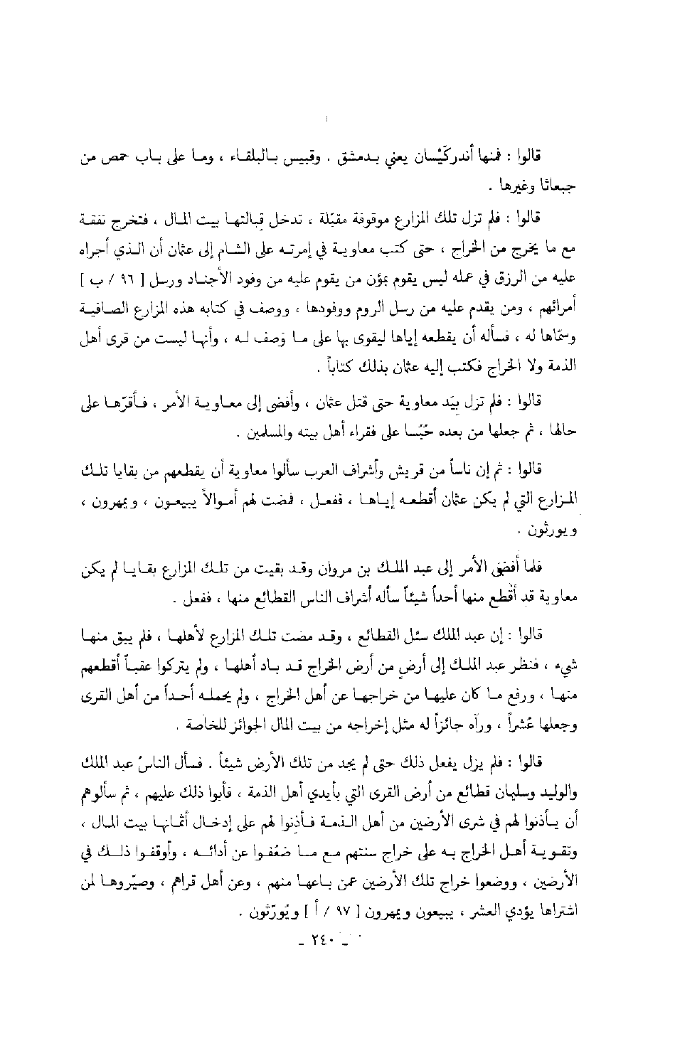 قالوا: فلم يزل يفعل ذلك حتى لم يجد من تلك الأرض شيئاً. فسأل الناس عبد الملك والوليد وسليمان قطائع من أرض القرى التي بأيدي أهل الذمة، فأبوا ذلك عليهم، ثم سألوهم أن يأذنوا لهم في شرى الأرضين من أهل الذمة فأذنوا لهم على إدخال أثمانها بيت المال، وتقوية أهل الخراج به على خراج سنتهم مع ما ضعفوا عن أدائه، وأوقفوا ذلك في الأرضين، ووضعوا خراج تلك الأرضين عمن باعها منهم، وعن أهل قراهم، وصيروها لمن اشتراها يؤدي العشر، يبيعون ويمهرون ويورثون.