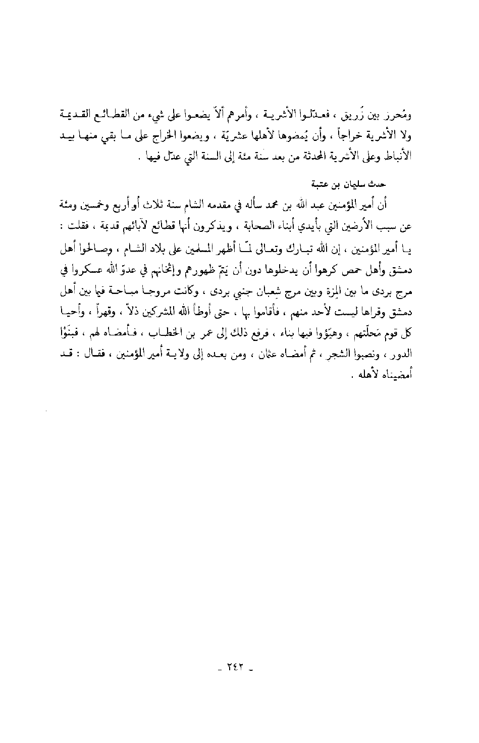 أن أمير المؤمنين عبد الله بن محمد سأله في مقدمة الشام سنة ثلاث أو أربع وخمسين ومئة عن سبب الأرضين التي بأيدي أبناء الصحابة، ويذكرون أنها قطائع لآبائهم قديمة، فقلت: يا أمير المؤمنين، إن الله تبارك وتعالى لما أظهر المسلمين على بلاد الشام، وصالحوا أهل دمشق وأهل حمص كرهوا أن يدخلوها دون أن يتم ظهورهم وإثخانهم في عدو الله عسكروا في مرج بردى ما بين المزة وبين مرج شعبان جنبي بردى، وكانت مروجاً مباحة فيما بين أهل دمشق وقراها ليست لأحد منهم، فأقاموا بها، حتى أوطأ الله المشركين ذلاً، وقهراً، وأحيا كل قوم محلتهم، وهيؤوا فيها بناء، فرفع ذلك إلى عمر بن الخطاب، فأمضاه لهم، فبنوا الدور، ونصبوا الشجر، ثم أمضاه عثمان، ومن بعده إلى ولاية أمير المؤمنين، فقال: قد أمضيناه لأهله.