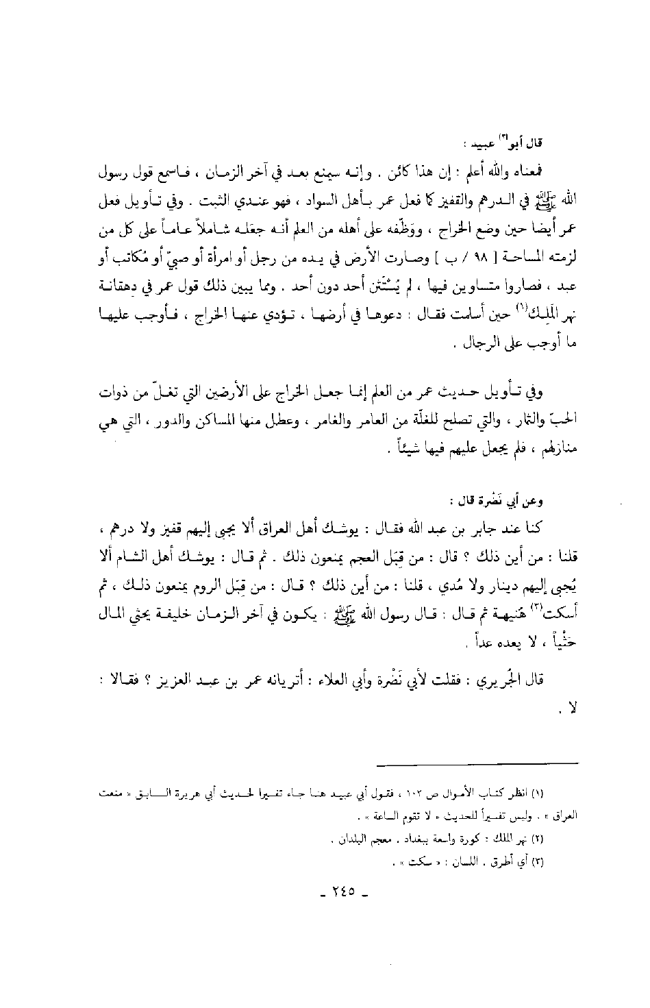 قال أبو عبيد: فمعناه والله أعلم: إن هذا كائن. وإنه سيمنع بعد في آخر الزمان، فاسمع قول رسول الله صَلَّى اللهُ عَلَيْهِ وَسَلَّمَ في الدرهم والقفيز كما فعل عمر بأهل السواد، فهو عندي الثبت. وفي تأويل فعل عمر أيضاً حين وضع الخراج، ووظفه على أهله من العلم أنه جعله شاملاً عاماً على كل من لزمته المساحة وصارت الأرض في يده من رجل أو امرأة أو صبي أو مكاتب أو عبد، فصاروا متساوين فيها، لم يستثنى أحد دون أحد. ومما يبين ذلك قول عمر في دهقانة نهر الملك حين أسلمت فقال: دعوها في أرضها، تؤدي عنها الخراج، فأوجب عليها ما أوجب على الرجال.