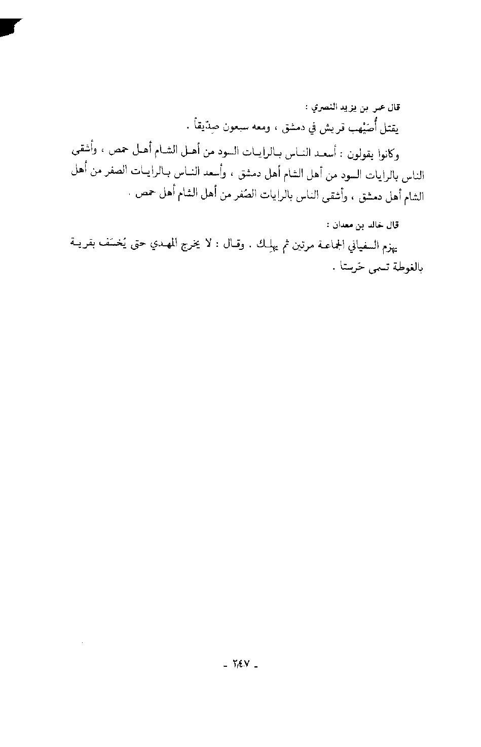وكانوا يقولون: أسعد الناس بالرايات السود من أهل الشام أهل حمص، وأشقى الناس بالرايات السود من أهل الشام أهل دمشق، واسعد الناس بالرايات الصفر من أهل الشام أهل دمشق، وأشقى الناس بالرايات الصفر من أهل الشام أهل حمص.