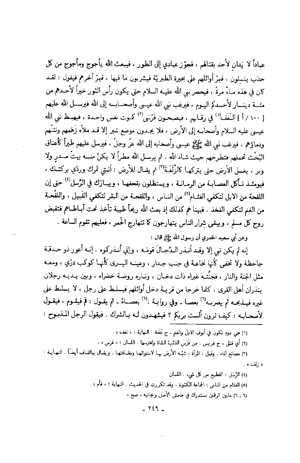 عباداً لا يدان لأحد بقتالهم، فجوز عبادي إلى الطور، فيبعث الله يأجوج ومأجوج من كل حدب ينسلون، فيمر أوائلهم على بحيرة الطبرية فيشربون ما فيها، فيمر آخرهم فيقول: لقد كان في هذه ماء مرة، فيحصر نبي الله عليه السلام حتى يكون رأس الثور خيراً لأحدهم من مئة دينار لأحدكم اليوم، فيرغب نبي الله عيسى وأصحابه إلى الله فيرسل الله عليهم النغف في رقابهم، فيصبحون فرسى كموت نفس واحدة، فيهبط نبي الله عيسى عليه السلام وأصحابه إلى الأرض، فلا يجدون موضع شبر إلا قد ملأه زهمهم ونتنهم ودماؤهم، فيرغب نبي الله صَلَّى اللهُ عَلَيْهِ وَسَلَّمَ عيسى وأصحابه إلى الله عز وجل، فيرسل عليهم طيراً كأعناق البخت تحملهم فتطرحهم حيث شاء الله. ثم يرسل الله مطراً لا يكن منه بيت مدر ولا وبر، يغسل الأرض حتى يتركها كالزلفة ثم يقال للأرض: أنبتي ثمرك وردي بركتك، فيومئذ تأكل العصابة من الرمانة، ويستظلون بقحفها، ويبارك في الرسل حتى إن اللقحة من الإبل لتكفي الفئام من الناس واللقحة من البقر لتكفي القبيل، واللقحة من الغنم لتكفي الفخذ. فبينا هم كذلك إذ بعث الله ريحاً طيبة تأخذ تحت آباطاهم فتقبض روح كل مسلم، ويبقى شرار الناس يتهارجون كما تتهارج الحمر، فعليهم تقوم الساعة.