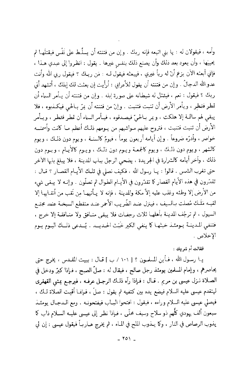 وأمه، فيقولان له: يا بني ابتعه فإنه ربك. وإن من فتنتة أن يسلط على نفس فيقتلها ثم يحييها، وأن يعود بعد ذلك وأن يصنع ذلك بنفس غيرها. يقول: انظروا إلى عبدي هذا، فإني أبعثه الآن يزعم أن له رباً غيري، فيبعثه فيقول له: من ربك؟ فيقول ربي الله وأنت عدو الله الدجال. وإن من فتنته أن يقول للأعرابي: أرأيت إن بعثت لك إبلك، أتشهد أني ربك؟ فيقول: نعم، فيتمثل له شيطانه على صورة إبله. وإن من فتنته أن يأمر السماء أن تمطر فتمطر، ويأمر الأرض أن تنبت فتنبت. وإن من فتنته أن يمر بالحي فيكذبوه، فلا يبقى لهم سائمة إلا هلكت، ويمر بالحي فيصدقوه، فيأمر السماء أن تمطر فتمطر، ويأمر الأرض أن تنبت فتنبت، فتروح عليهم مواشيهم من يومها ذلك أعظم ما كانت وأسمنه خواصر، وأدره ضروعاً. وإن أيامه أربعون يوماً، فيوم كالسنة، ويوم دون ذلك، ويوم كالشهر، ويوم دون ذلك، ويوم كالجمعة ويوم دون ذلك، ويوم كالأيام، ويوم دون ذلك، وآخر أيامه كالشرارة في الجريدة، يضحي الرجل بباب المدينة، فلا يبلغ بابها الآخر حتى تغرب الشمس. قالوا: يا رسول الله، فكيف نصلي في تلك الأيام القصار؟ قال: تقدرون في هذه الأيام القصار كمنا تقدرون في الأيام الطوال ثم تصلون. وإنه لا يبقى شيء من الأرض إلا وطئه وغلب عليه إلا مكة والمدينة، فإنه لا يأتيها من نقب من أنقابها إلا لقيه ملك مصلت بالسيف، فينزل عند الضريب الأحمر عند منقطع السبخة عند مجتمع السيول. ثم ترجف المدينة بأهلها ثلاث رجفات فلا يبقى منافق ولا منافقة إلا خرج، فتنفي المدينة يومئذ خبثها كما ينفي الكير خبث الحديد. يدعى ذلك اليوم يوم الإخلاص.
