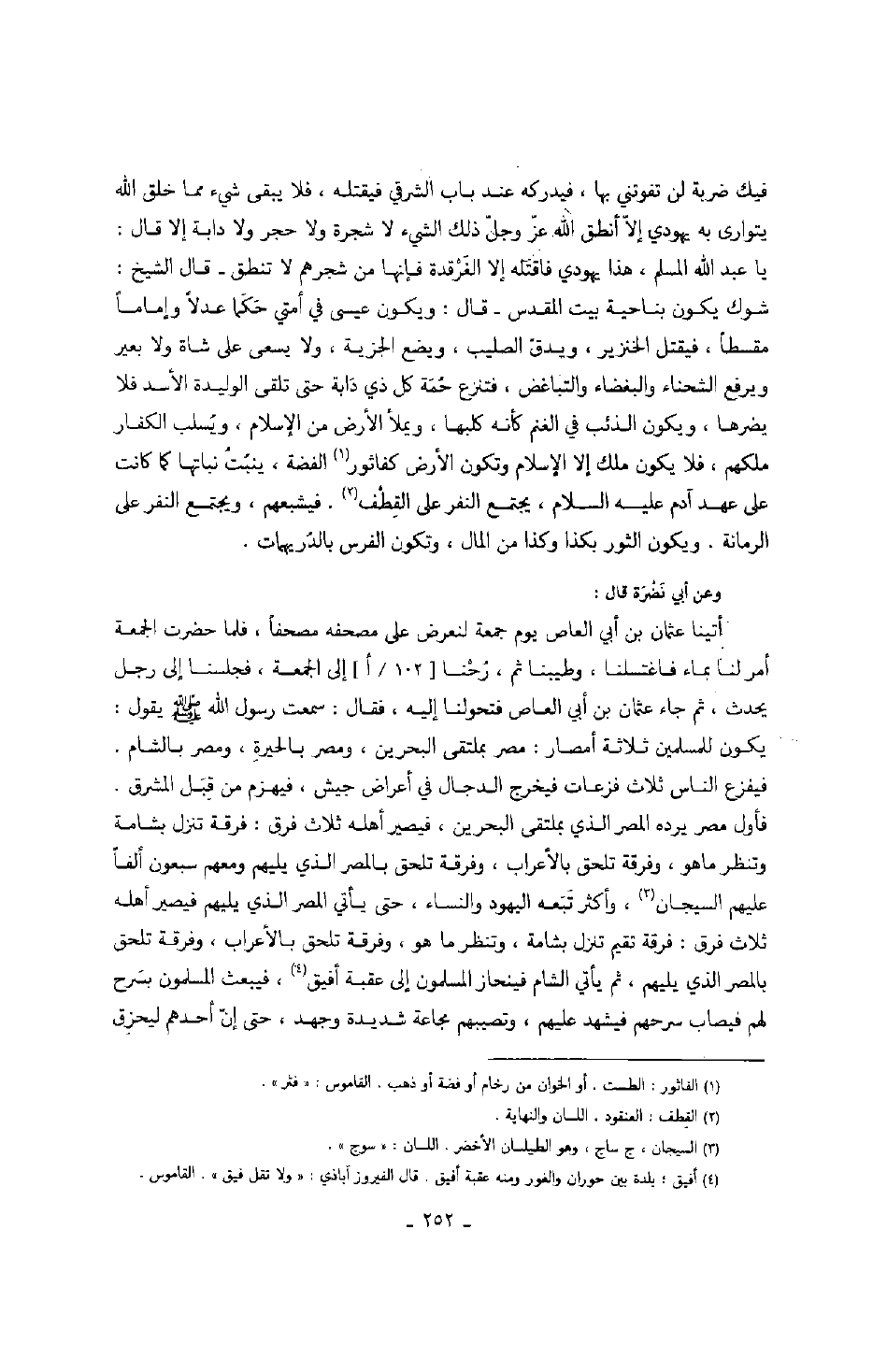 وعن أبي نضرة قال: أتينا عثمان بن أبي العاص يوم جمعة لنعرض على مصحفه مصحفاً، فلما حضر الجمعة أمر لنا بماء فاغتسلنا، وطيبنا ثم، رحنا إلى الجمعة، فجلسنا إلى رجل يحدث، ثم جاء عثمان بن أبي العاص فتحولنا إليه، فقال: سمعت رسول الله صَلَّى اللهُ عَلَيْهِ وَسَلَّمَ يقول: يكون للمسلمين ثلاثة أمصار: مصر بملتقى البحرين، ومصر بالحيرة، ومصر بالشام. فيفزع الناس ثلاث فزعات فيخرج الدجال في أعراض جيش، فيهزم من قبل المشرق. فأول مصر يرده المصر الذي بملتقى البحرين، فيصير أهله ثلاث فرق: فرقة تنزل بشامة وتنظر ما هو، وفرقة تلحق بالأعراب، وفرقة تلحق بالمصر الذي يليهم ومعهم سبعون ألفاً عليهم السيجان، وأكثر تبعه اليهود والنساء حتى يأتي المصر الذي يليهم فيصير أهله ثلاث فرق: فرقة تقيم تنزل بشامة، وتنظر ما هو، وفرقة تلحق بالأعراب، وفرقة تلحق المصر الذي يليهم، ثم يأتي الشام فينحاز المسلمون إلى عقبة أفيق، فيبعث المسلمون بسرح لهم فيصاب سرحهم فيشهد عليهم، وتصيبهم مجاعة شديدة وجهد، حتى إن أحدهم ليحزق