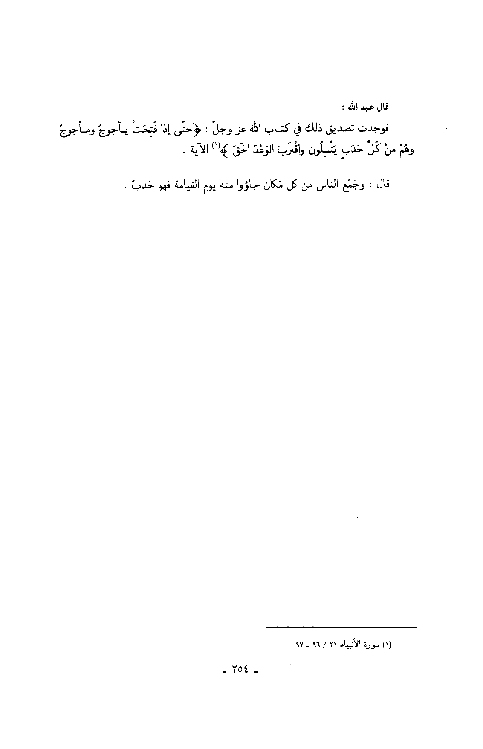 قال عبد الله: فوجدت تصديق ذلك في كتاب الله عز وجل: " حتى إذا فتحت يأجوج ومأجوج وهم من كل حدب ينسلون واقترب الوعد الحق " الآية.
