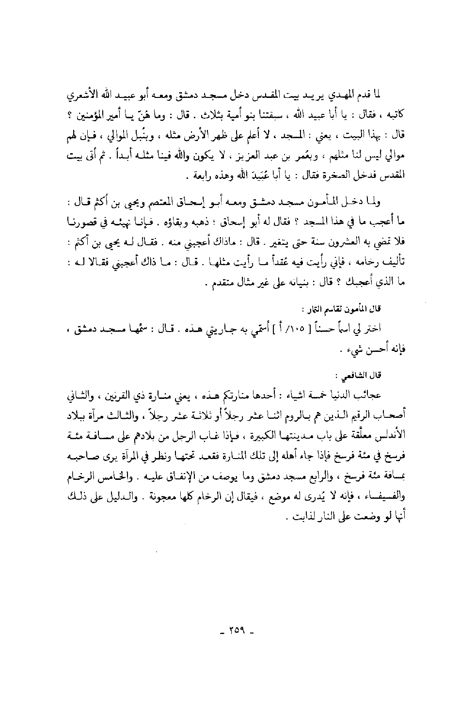 قال الشافعي: عجائب الدنيا خمسة أشياء: أحدها منارتكم هذه، يعني منارة ذي القرنين، والثاني أصحاب الرقيم الذين هم بالروم اثنا عشر رجلاً أو ثلاثة عشر رجلاً، والثالث مرآة ببلادة الأندلس معلقة على باب مدينتها الكبيرة، فإذا غاب الرجل من بلادهم على مسافة مئة فرسخ في مئة فرسخ فإذا جاء أهله إلى تلك المنارة فقعد تحتها ونظر في المرآة يرى صاحبه بمسافة مئة فرسخ، والرابع مسجد دمشق وما يوصف من الإنفاق عليه. والخامس الرخام والفسيفساء، فإنه لا يدرى له موضع، فيقال إن الرخام كلها معجونة. والدليل على ذلك أنه لو وضعت على النار لذابت.