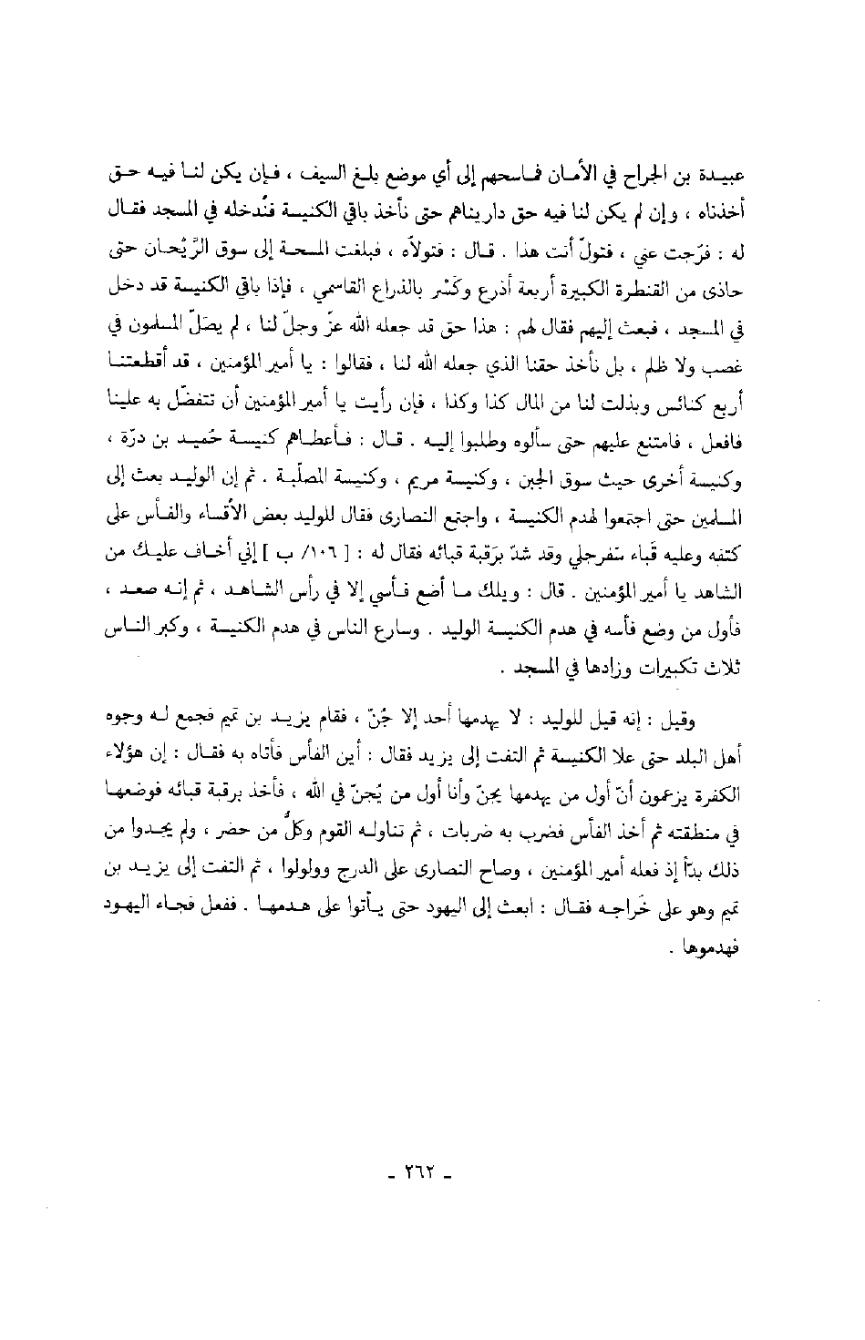 عبيدة بن الجراح في الأمان فماسحهم إلى أي موضع بلغ السيف، فإن يكن لنا فيه حق أخذناه، وإن لم يكن لنا فيه حق داريناهم حتى نأخذ باقي الكنيسة فندخله في المسجد فقال له: فرجت عني، فتول أنت هذا. قال: فتولاه، فبلغت المسحة إلى سوق الريحان حتى حاذى من القنطرة الكبيرة أربعة أذرع وكسر بالذراع القاسمي، فإذا باقي الكنيسة قد دخل في المسجد، فبعث إليهم فقال لهم: هذا حق قد جعل الله عز وجل لنا، لم يصل المسلمون في غصب ولا ظلم، بل نأخذ حقنا الذي جعله الله لنا، فقالوا: يا أمير المؤمنين، قد أقطعتنا أربع كنائس وبذلت لنا من المال كذا وكذا، فإن رأيت يا أمير المؤمنين أن تتفضل به علينا ففعل، فامتنع عليهم حتى سألوه وطلبوا إليه. قال: فأعطاهم كنيسة حميد بن درة، وكنيسة أخرى حيث سوق الجبن، وكنيسة مريم، وكنيسة المصلبة. ثم إن الوليد بعث إلى المسلمين حتى اجتمعوا لهدم الكنيسة، واجتمع النصارى فقال للوليد بعض الأقساء والفأس على كتفه وعليه قباء سفرجلي وقد شد برقبة قبائه فقال له: إني أخاف عليك من الشاهد يا أمير المؤمنين. قال: ويلك ما أضع فأسي إلا في رأس الشاهد، ثم إنه صعد، فأول من وضع فأسه في هدم الكنيسة الوليد. وسارع الناس في هدم الكنيسة، وكبر الناس ثلاث تكبيرات وزادها في المسجد.