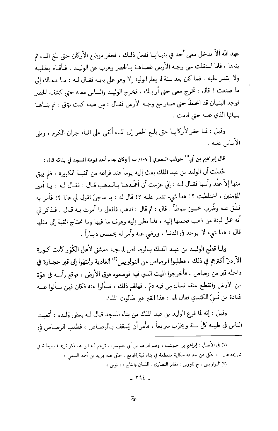 عهد الله ألا يدخل معي أحد في بنيانها ففعل ذلك، فحفر موضع الأركان حتى بلغ الماء ثم بناها، فلما استقلت على وجه الأرض غطاها بالحصر وهرب عن الوليد، فأقام يطلبه ولا يقدر عليه. فلما كان بعد سنة لم يعلم الوليد إلا وهو على بابه فقال له: ما دعاك إلى ما صنعت! قال: تخرج معي حتى أريك، فخرج الوليد والناس معه حتى كشف الحصر فوجد البنيان قد انحط حتى صار مع وجه الأرض فقال: من هذا كنت تؤتى، ثم بناها بنيانها الذي عليه حتى قامت.