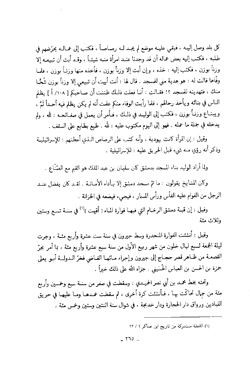 كل بلد وصل إليه، فبقي عليه موضع لم يجد له رصاصاً، فكتب إلى عماله يحرضهم في طلبه، فكتب إليه بعض عماله أن قد وجدنا عند امرأة منه شيئاً، وقد أبت أن تبيعه إلا وزناً بوزن، فكتب إليه: خذه، وإن أبت إلا وزناً بوزن، فأخذه منها وزناً بوزن، فلما وفاها قالت له: هو هدية مني للمسجد. قال لها: أنت أبيت أن تبيعي إلا وزناً بوزن شحاً منك، فتهدينه للمسجد؟! فقالت: أنا فعلت ذلك ظننت أن صاحبكم يظلم الناس في بنائه ويأخذ رحالهم، فلا رأيت الوفاء منكم علمت أنه لم يكن يظلم فيه أحداً ثم، ويبتاع وزناً بوزن، فكتب إلى الوليد في ذلك، فأمر أن يعمل في صفائحه: لله، ولم يدخله في جملة ما عمله. فهو إلى اليوم مكتوب عليه: لله. طبع بطابع على السقف.