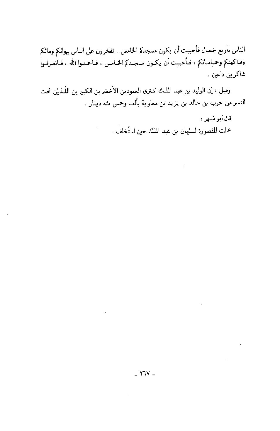 وقيل: إن الوليد بن عبد الملك اشترى العمودين الأخضرين الكبيرين اللذين تحت النسر من حرب بن خالد بن يزيد بن معاوية بألف وخمس مئة دينار.
