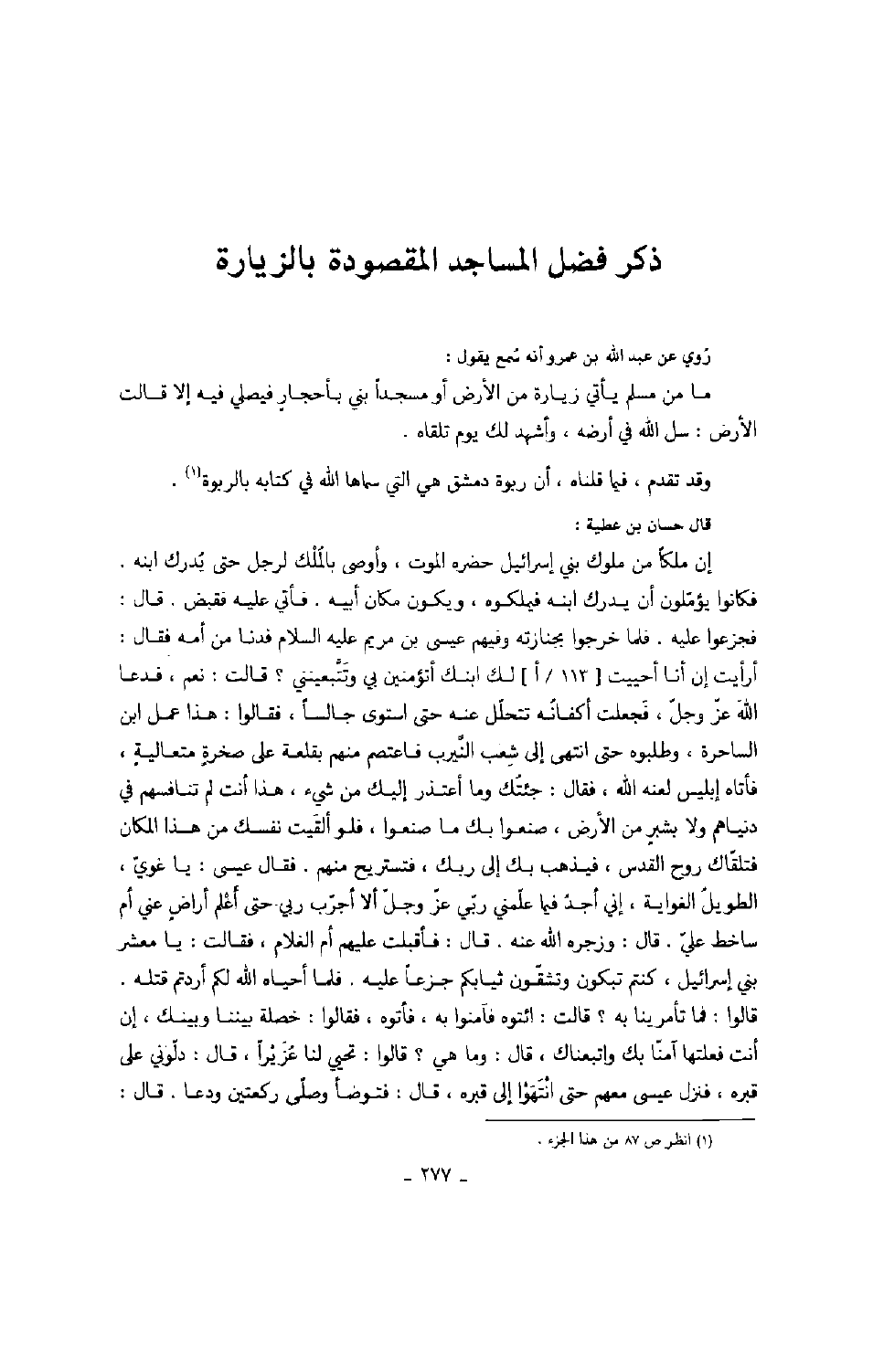 روي عن عبد الله بن عمرو أنه سمع يقول: ما من مسلم يأتي زيارة من الأرض أو مسجداً بني بأحجار فيصلي فيه إلا قالت الأرض: سل الله في أرضه، وأشهد لك يوم تلقاه.