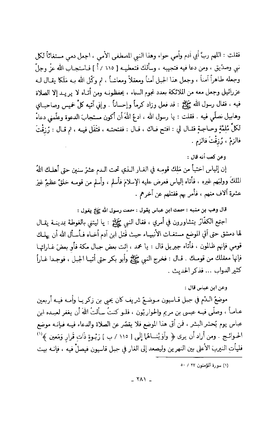 وعن ابن عباس قال: موضع الدم في جبل قاسيون موضع شريف كان يحيى بن زكريا وأمه فيه أربعين عاماً، وصلى فيه عيسى بن مريم والحواريون، فلو كنت سألت الله أن يغفر لعبده ابن عباس يوم يحشر البشر، فمن أتى هذا الموضع فلا يقصر عن الصلاة والدعاء فيه فإنه موضع الحوائج. ومن أراد أن يرى " وآويناهما إلى ربوة ذات قرار ومعين " فليأت النيرب الأعلى بين النهرين وليصعد إلى الغار في جبل قاسيون فيصل فيه، فإنه بيت
