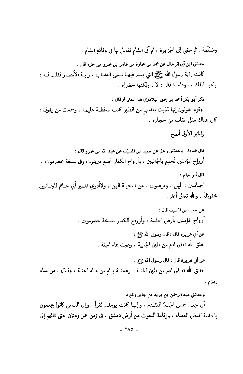 عن سعيد بن المسيب قال: أرواح المؤمنين بأرض الجابية، وأرواح الكفار بسبخة حضرموت.