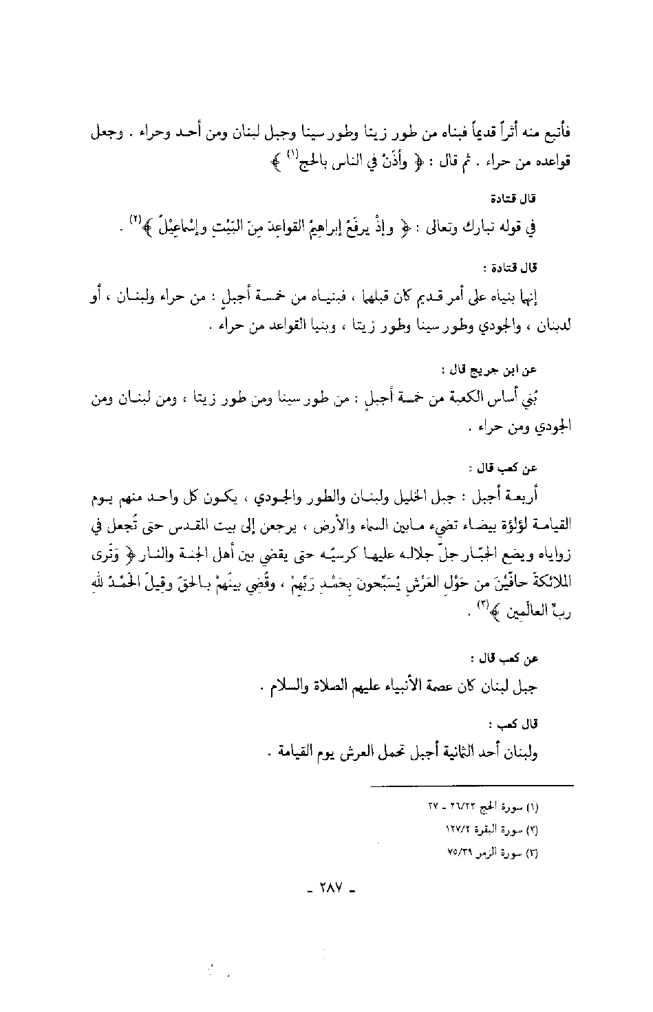 عن ابن جريج قال: بني أساس الكعبة من خمسة أجبل: من طور سينا وطور زيتا، ومن لبنان ومن الجودي ومن حراء.