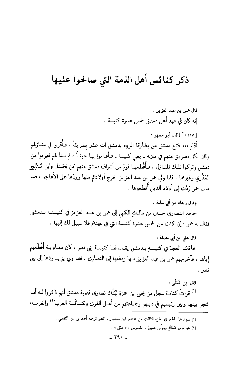 قال عمر بن عبد العزيز: إنه كان في عهد أهل دمشق خمس عشرة كنيسة.