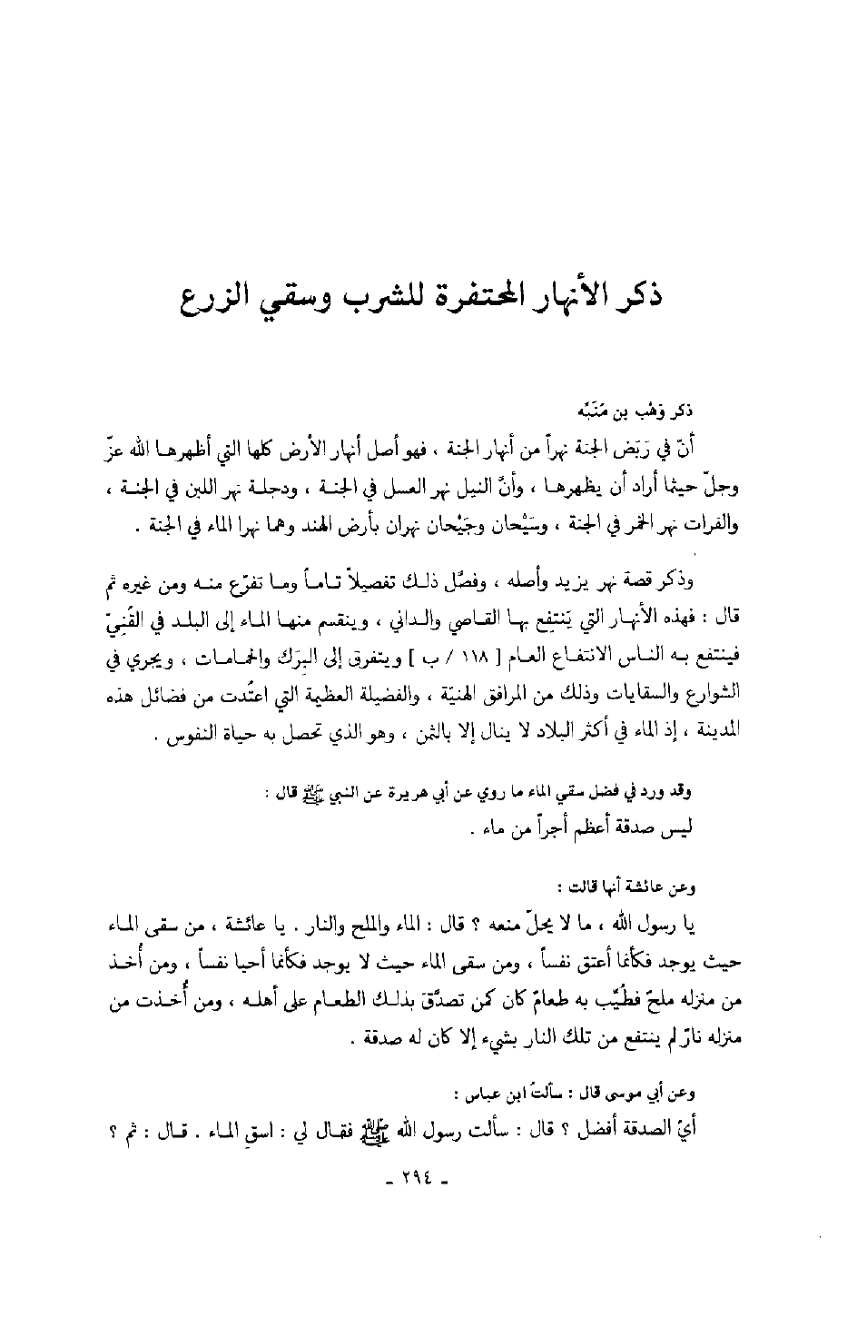 وقد ورد في فضل سقي الماء ما روي عن أبي هريرة عن النبي صَلَّى اللهُ عَلَيْهِ وَسَلَّمَ قال: ليس صدقة أعظم أجراً من ماء.